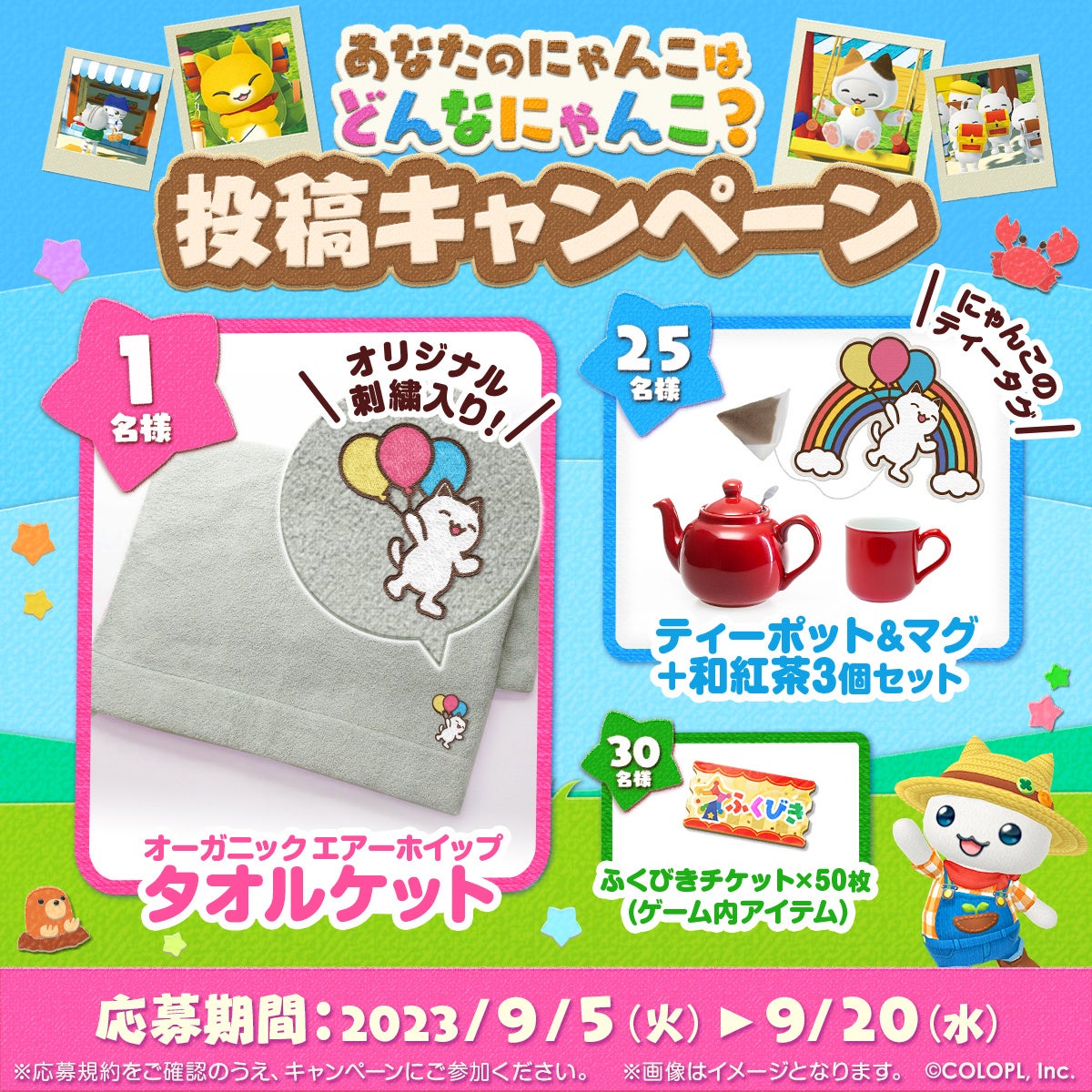 投稿してくださった方の中から抽選で、ふんわりと上質な肌触りの「オリジナルタオルケット(にゃんこの刺繍入り)」などをプレゼント!