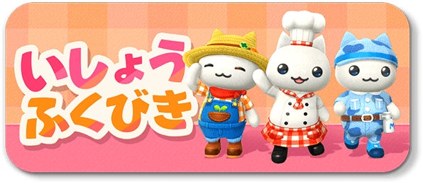 にゃんこに着せられる「いしょう」が手に入る「ふくびき」が登場しました。「いしょう」は「あたま」「かお」「からだ」に着せることができるので、様々な「いしょう」を組み合わせて、にゃんこ達に可愛く着せてあげましょう。