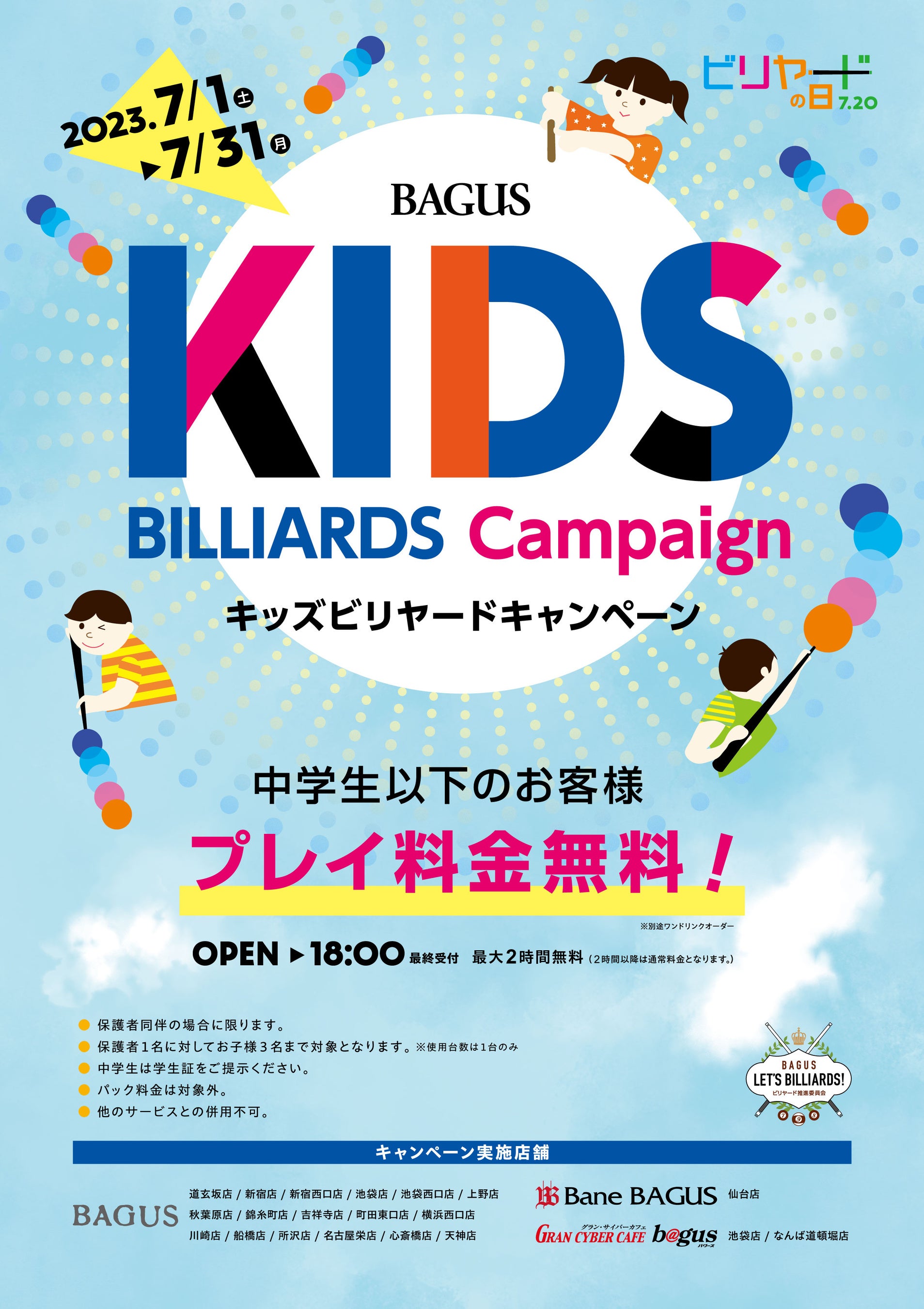 【7月20日はビリヤードの日】親子で遊べば2倍楽しい!保護者同伴で「中学生以下ビリヤード料金無料」やビリヤードをイメージした「オリジナルドリンク販売」などキャンペーン開催 ~バグース~