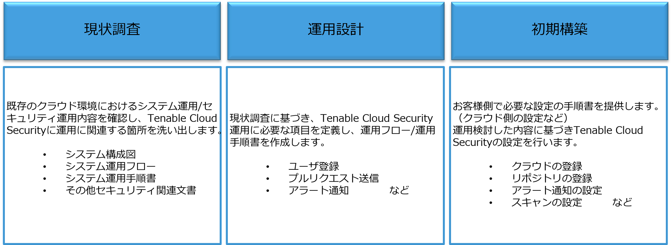 Tenable Cloud Securityの運用に必要のある項目を洗い出し、円滑な運用を支援します。