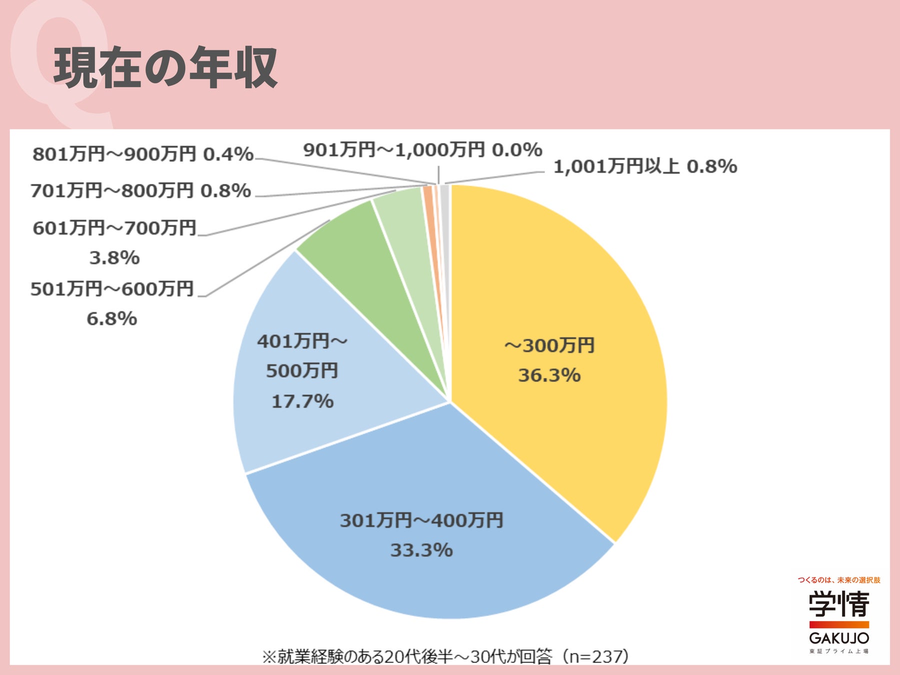 職歴のある20代後半~30代の現在の年収は、「~300万円」が36.3%で最多。次いで、「301万円~400万円」33.3%、「401万円~500万円」17.7%が続きました。
