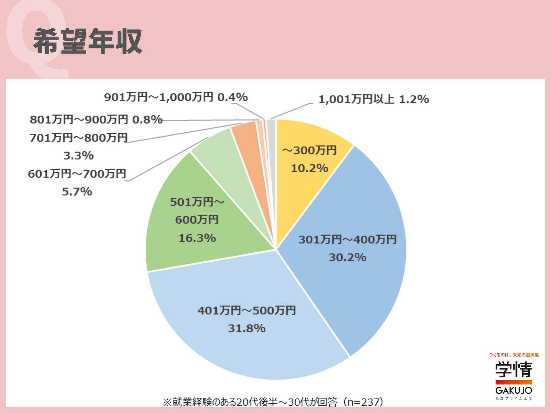 株式会社学情(本社:東京都中央区)は、20代後半~30代の仕事観や働く意識をひも解くために、アンケート調査を実施しました。今回は、「年収」に関して調査。希望年収は「401~500万円」が最多。次いで「301~400万円」、「501万円~600万円」が続きました。「601~700万円」「701万円~800万円」「801万円~900万円」「901万円~1,000万円」「1,001万円以上」の結果を合わせると、4人に1人が501万円以上の年収を望んでいることがわかります。