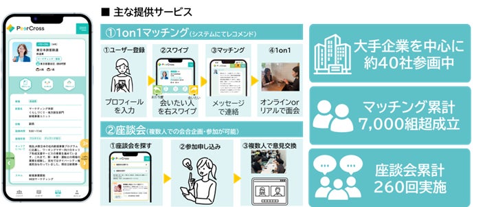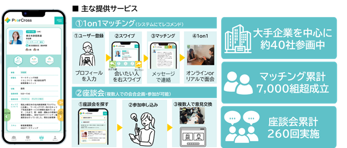 「PeerCross」は、安心・安全に社内外問わず、価値観境遇の近い複数人の身近なロールモデルとの出会いを通じてキャリアに対して利用者の前向きな意識変容・行動変容を起こす企業向けキャリア形成支援サービスです。