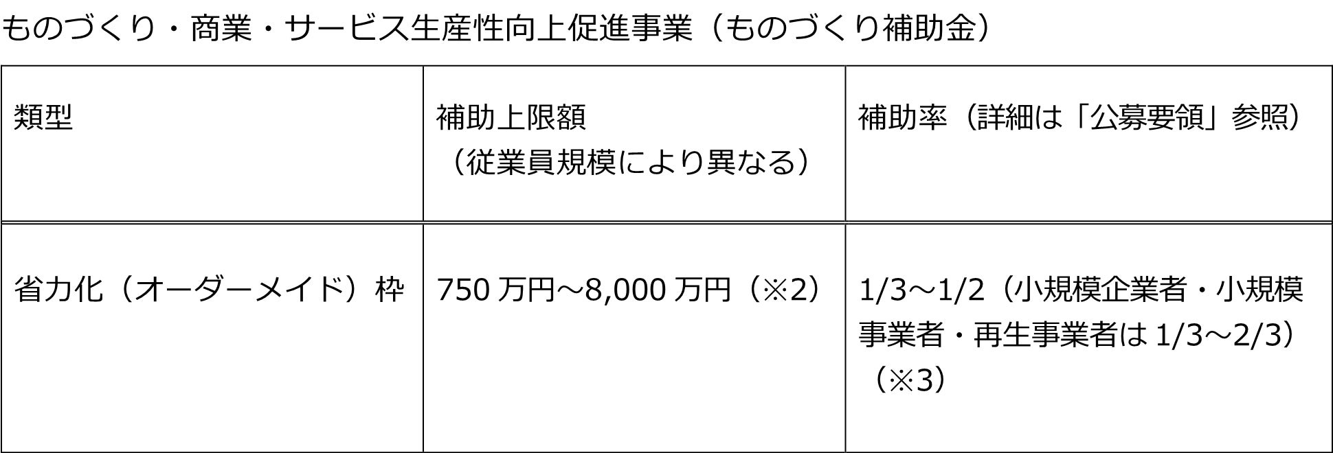 ※1 デジタル技術等を活用した専用設備(オーダーメイド設備)とは、ICTやIoT、AI、センサー等を活用し、単一もしくは複数の生産工程を自動化するために、外部のシステムインテグレータ(SIer)との連携などを通じて、事業者の個々の業務に応じて専用で設計された機械装置やシステム(ロボットシステム等)のことをいいます。デジタル技術等を活用せず、単に機械装置等を導入する事業については、本事業の対象とはなりません。