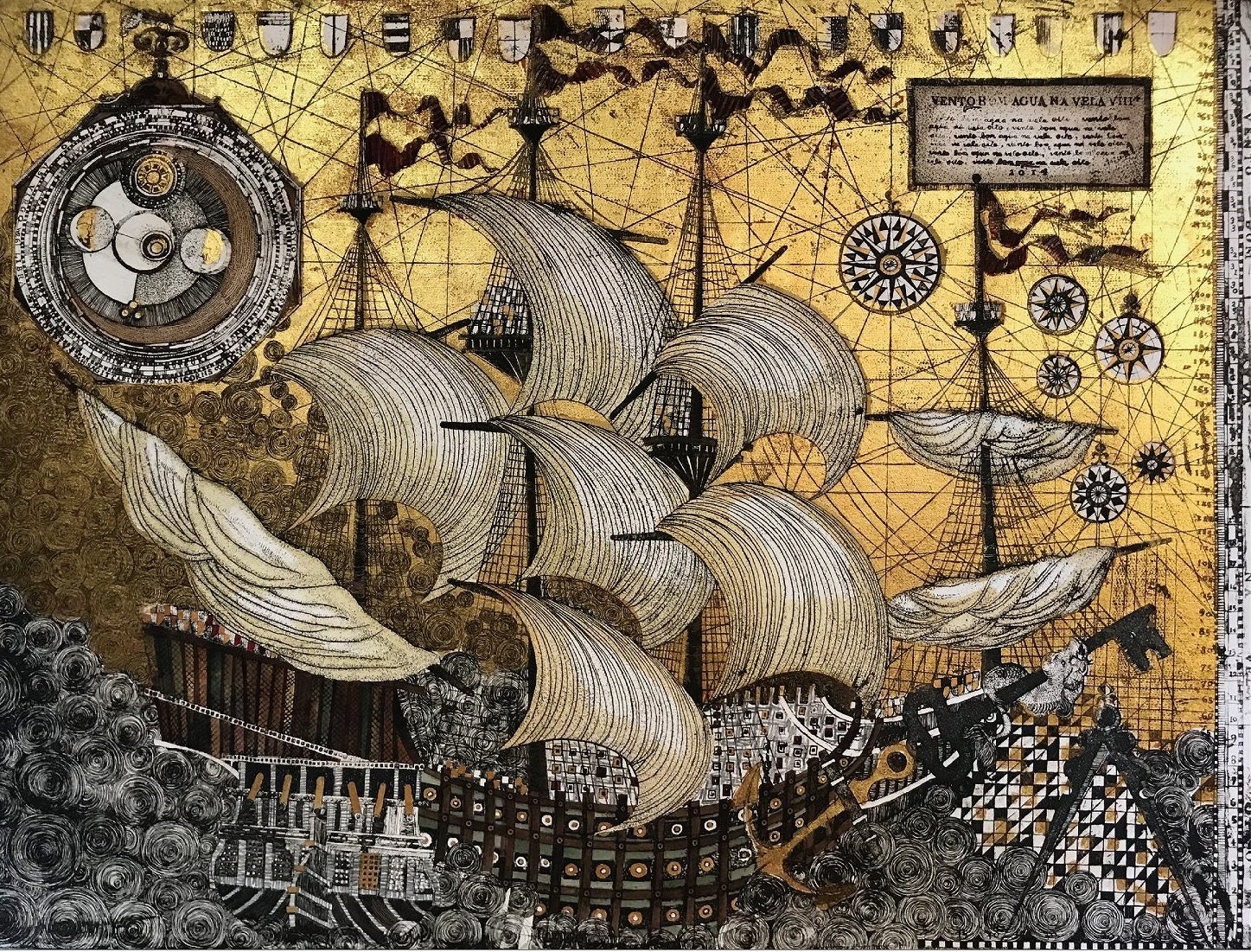 時間の集積から生まれる存在感。坪内好子は、この存在感をことさら愛する。画面背景に金箔が押され、さらに版を刷り重ねていく。するとそこにはまるで永い時間の集積があったかのようなマチエールが現れる。ずっと 前からそこに在り、そしてこれからもずっとそこに存在するかのような無限性をもった空間無限性という時間に包まれた有限な「もの」や「かたち」が呼応し共鳴しあい画面全体の存在感が生まれてくる。本当の時間の集積がはじまる。刻、一刻と時間と溶けあい馴染んでくると・・・
