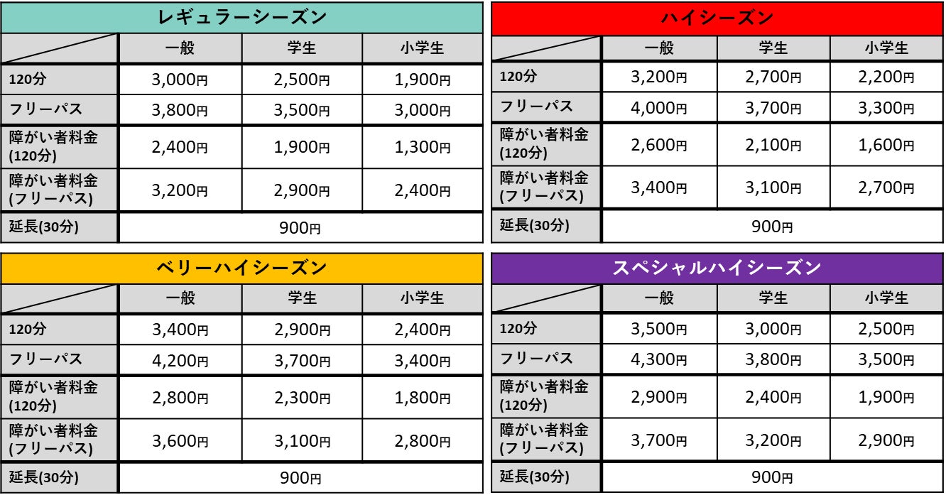 VS PARKは4種類の料金パターン(レギュラーシーズン料金・ハイシーズン料金・ベリーハイシーズン料金・スペシャルハイシーズン料金)になります。日別に料金パターンを設定しておりますので、ご来店前にVS PARK各店舗公式サイトの「料金カレンダー」をご覧いただき、ご利用日当日の料金をお確かめください。
