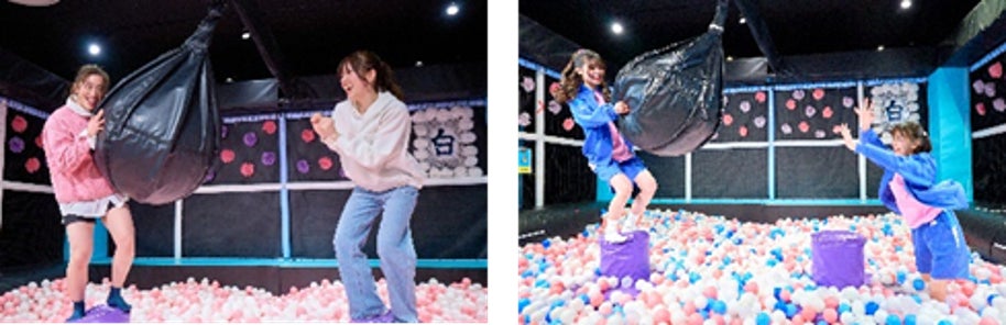 台の上に立ち、巨大なボールを押し合って、相手をボールプールに落とそう!