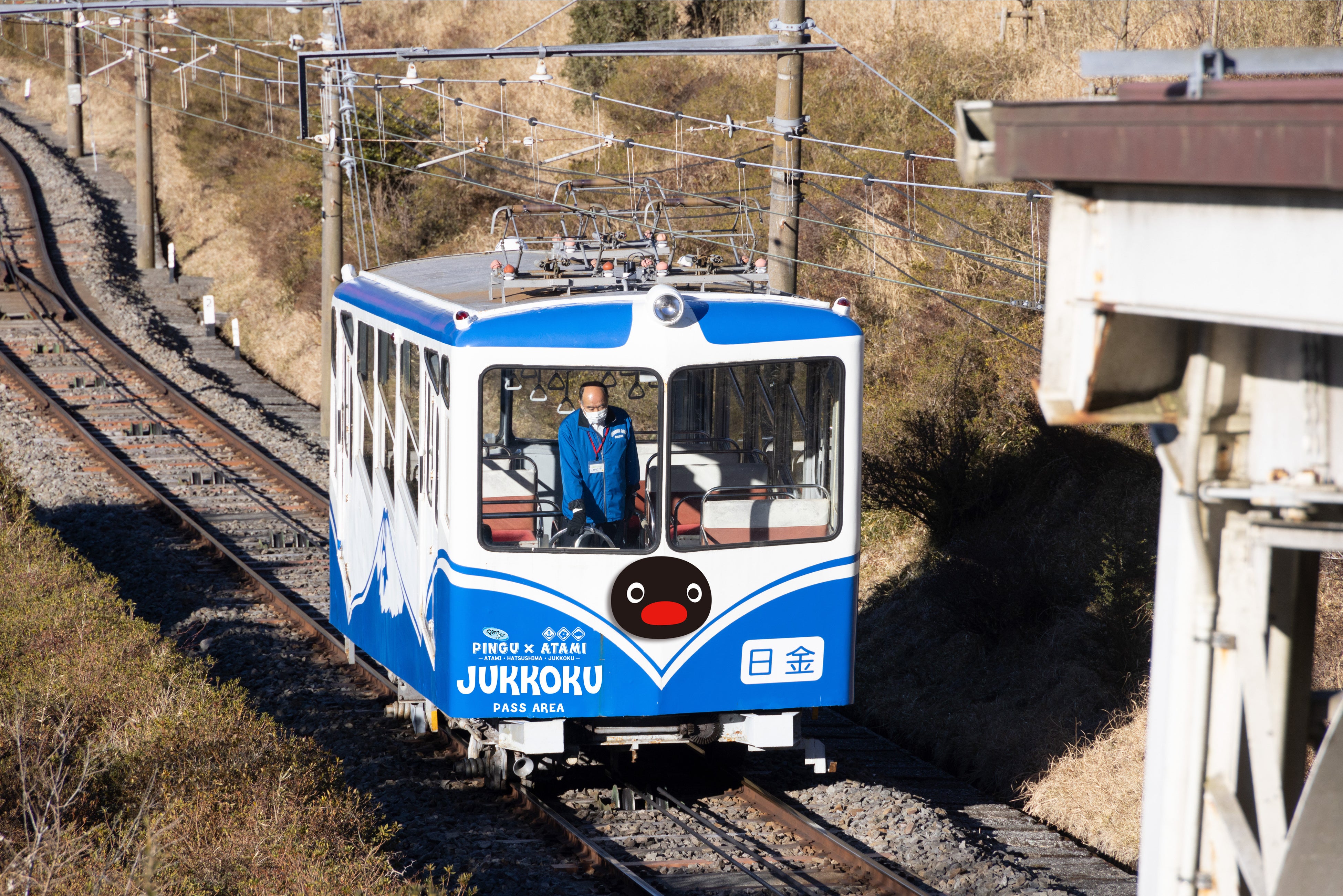 十国峠山麓から山頂絶景展望デッキ「PANORAMA TERRACE 1059」を結ぶ十国峠パノラマケーブルカーがピングーの世界観たっぷりにデコレーションされ、コラボケーブルカーとして運行いたします。