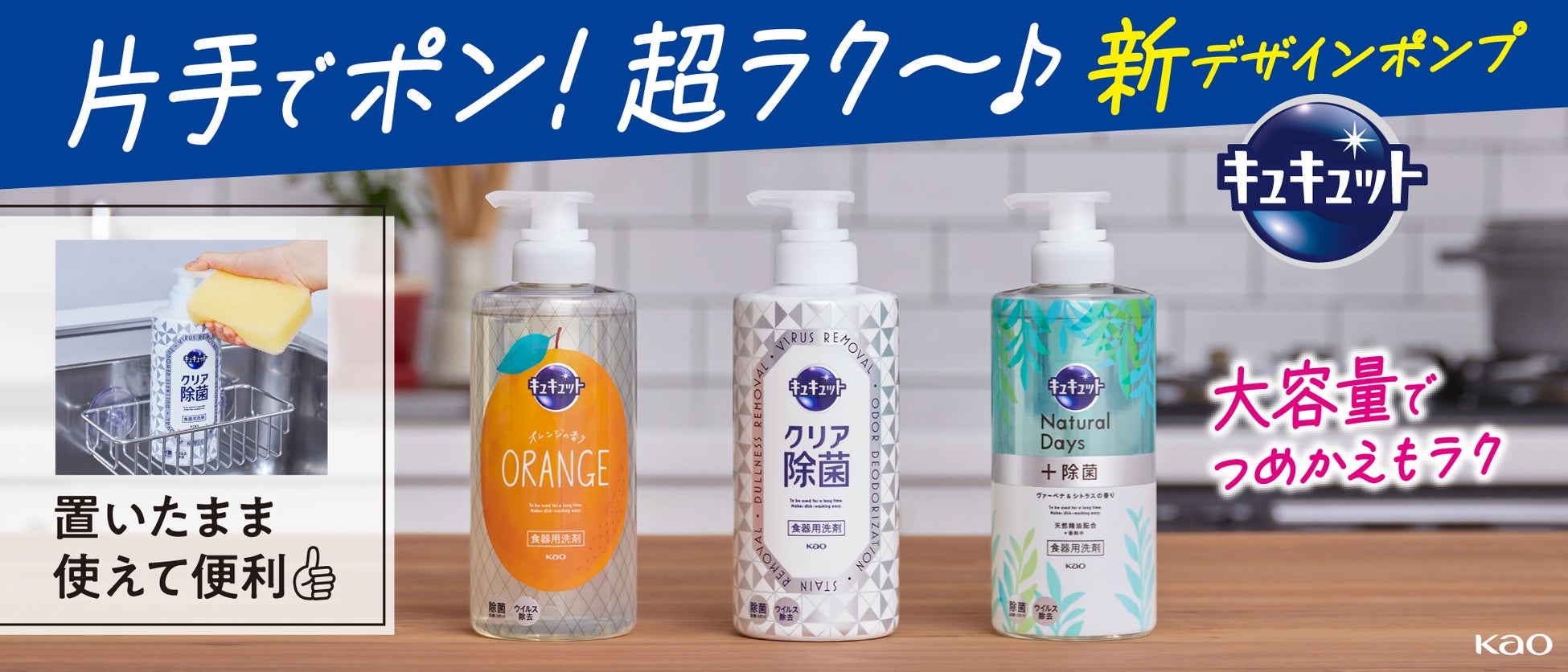 共働き世帯が増加して家事分担が進み、家事の効率化が一層求められ、「食器洗いをラクにしたい」というニーズも高まっていることを受け、「キュキュット」は、ラクにプッシュできて使いやすい機能性とデザイン性を兼ね備えたポンプタイプを2015年から提案してまいりました。