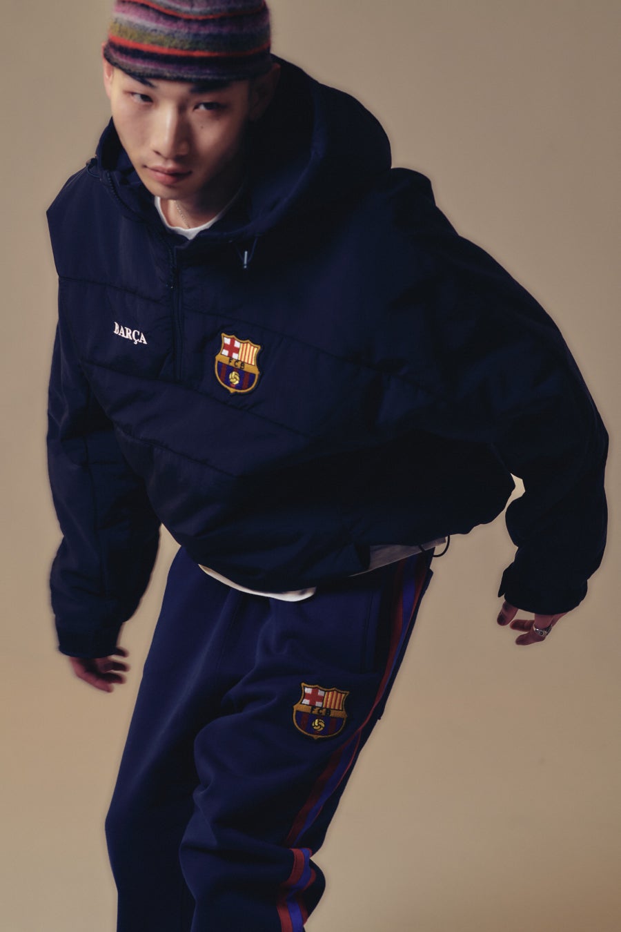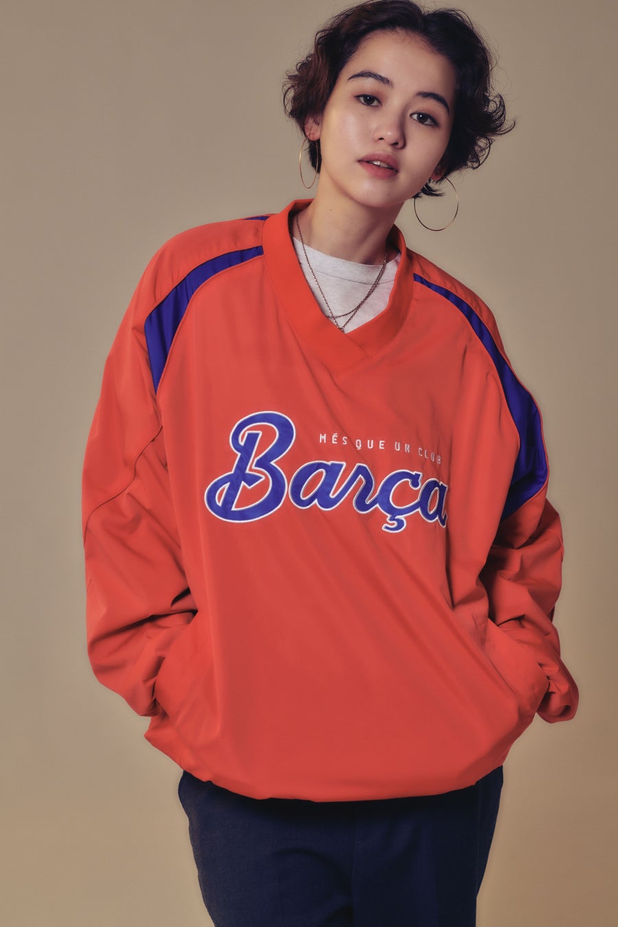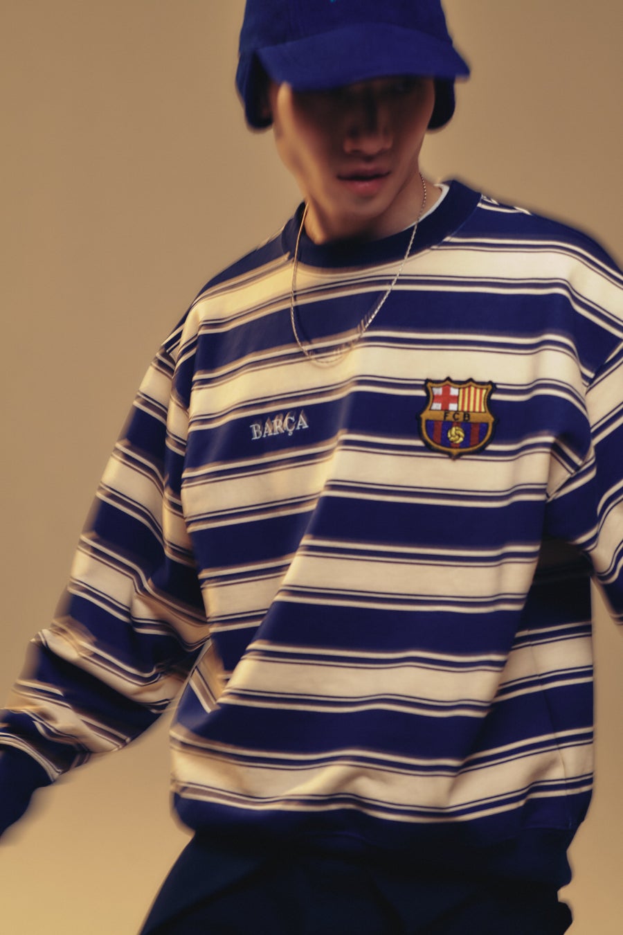 「BARÇA」のロゴが目を引くプルオーバーのジャケットや、ストライプ柄が印象的なクルーネックのスウェットなどこれからの季節にぴったりなアイテムを数多く展開する。