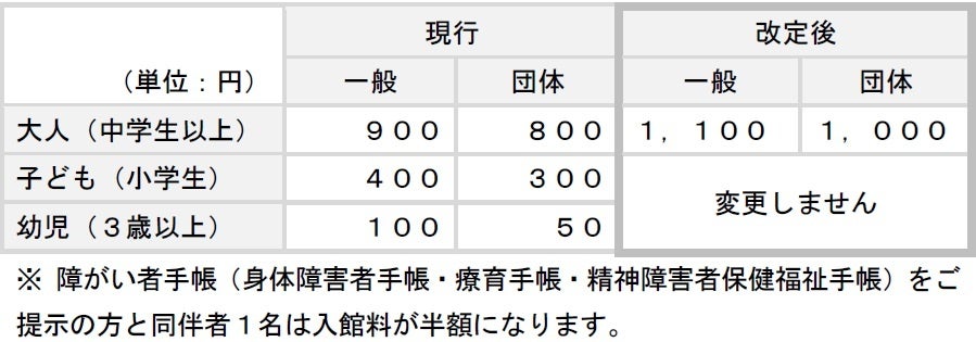 また、昨今の物価・人件費等の高騰を背景として、大人の入館料を税込200円、見直しさせていただきます。(子ども・幼児は変更しません)