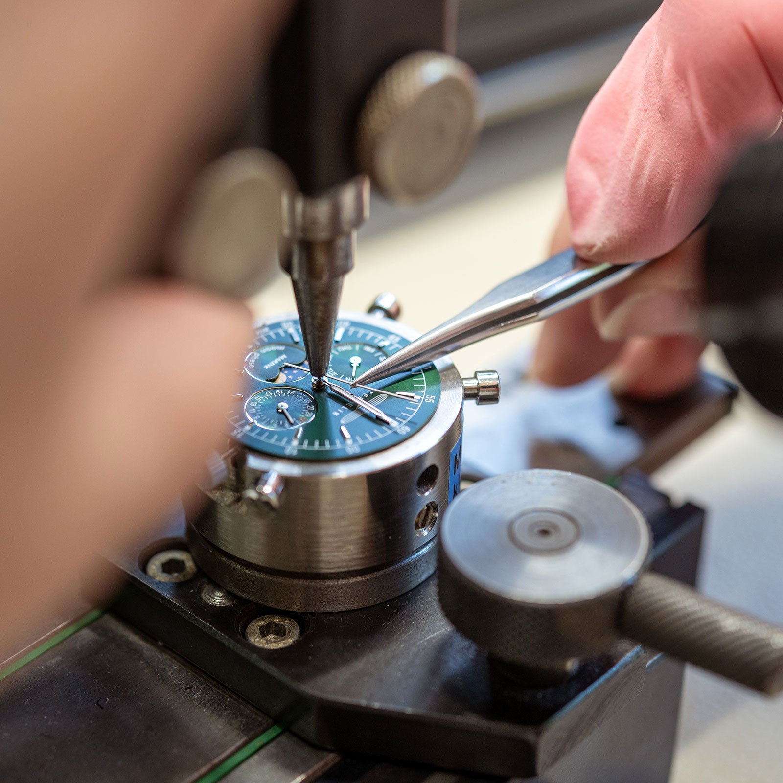 代表的なモデルに見られるドーム型のガラス風防や、周縁部に向けてカーブするガルバニック加工が施された文字盤などをはじめとする高品質なパーツを随所に採用。ドイツ国内の工場で「MADE IN GERMANY」を掲げるために必要な厳しい基準をクリアした高い品質を保っています。