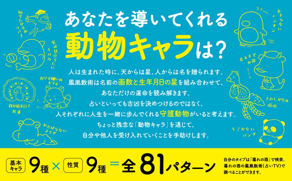 大阪ミナミの老舗占い館で18年間No.1の座に君臨。さらに8万人の鑑定実績を持ち、「とにかく当たる」「全力で励ましてくれる」「最後まで親身に寄り添ってくれる」と注目の占術家、暮れの酉のオリジナル占い、「鳳凰数術」は、名前の画数と生年月日(基本キャラクター9種×性質9種=全81パターン)からあなただけの動物キャラを導き出す、全く新しい姓名占いです。