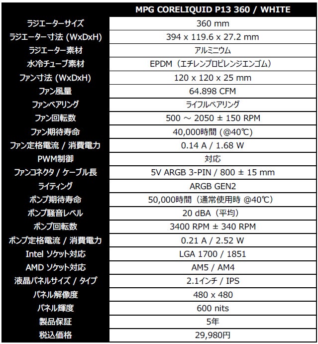 【MPG CORELIQUID P13 360 / WHITEの主な特徴】