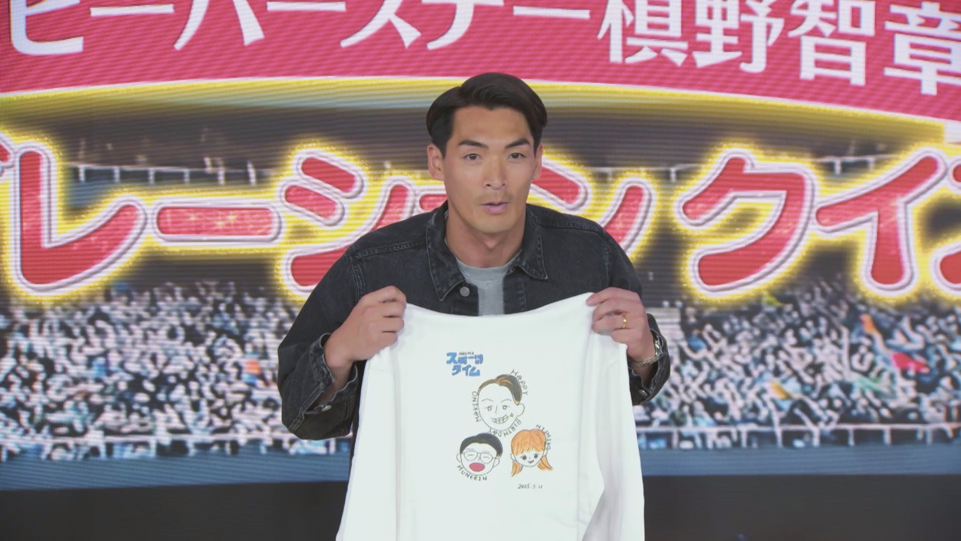 全身を使って解説した槙野さんは、放送日である5月11日(日)が38歳の誕生日。番組から誕生日プレゼントとして、槙野さん、川﨑さん、「ABEMA」の西澤由夏アナウンサーのレギュラーメンバー3人が描かれたオリジナルパーカーをプレゼントしました。