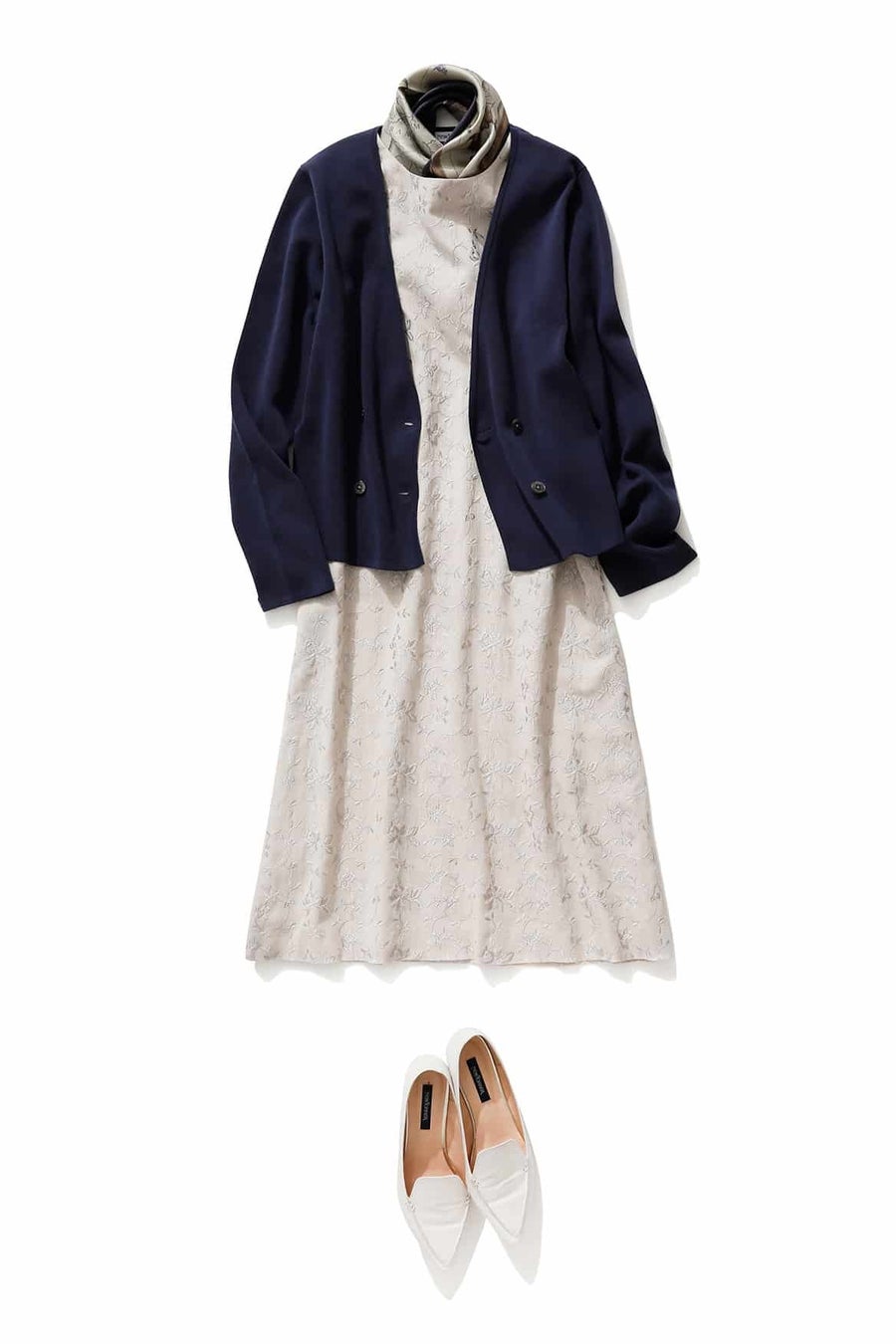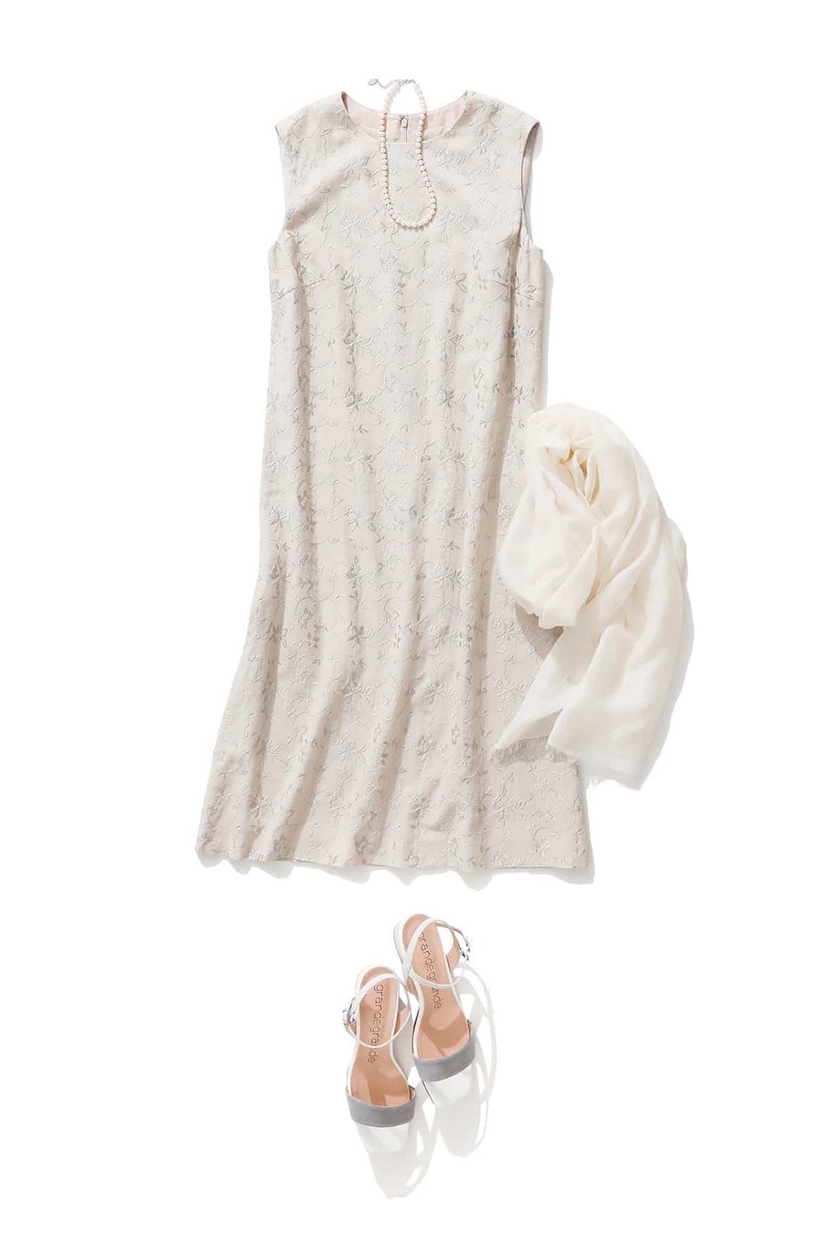 シンプルに纏うドレススタイル。パールのネックレスとふんわりとしたストールを合わせることで、エレガントさがアップ。ワンランク上のクワイエットラグジュアリースタイルが愉しめます。