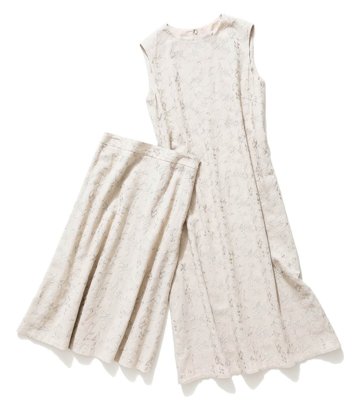 贅沢に施した刺繍の美しさを際立たせるため、あえてシンプルに仕立てたノースリーブドレスとAラインスカート。ダーツや、シルエットのデザイン線で刺繍が切れないよう、生地配置に拘りました。流れるようなラインが生み出すエレガントな佇まいが、洗練された大人の装いに相応しいアイテムです。カラーはベージュの1色展開。