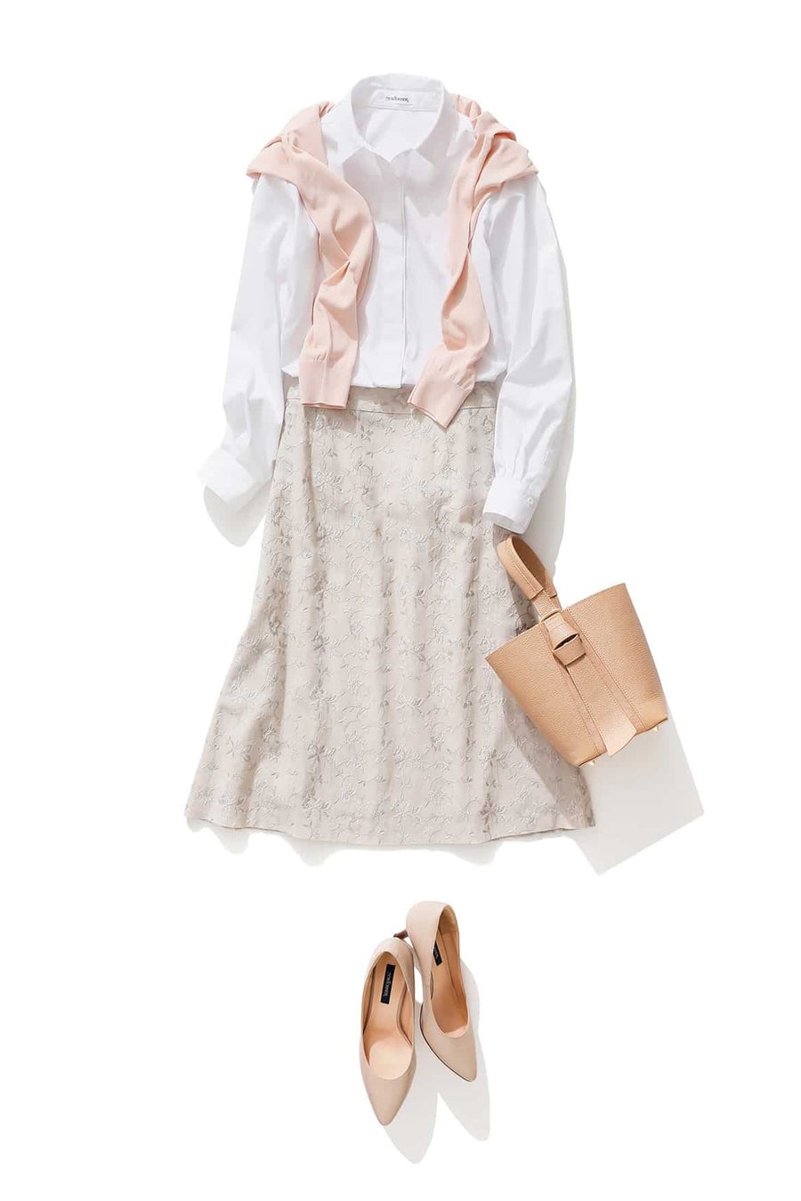 清潔感あふれる白シャツの魅力を、存分に引き立たせるきれいめスタイル。淡いピンクのカーディガンを添えれば、春らしい華やかな印象に。小物はベージュで揃えて大人の余裕を感じさせるコーデが完成。