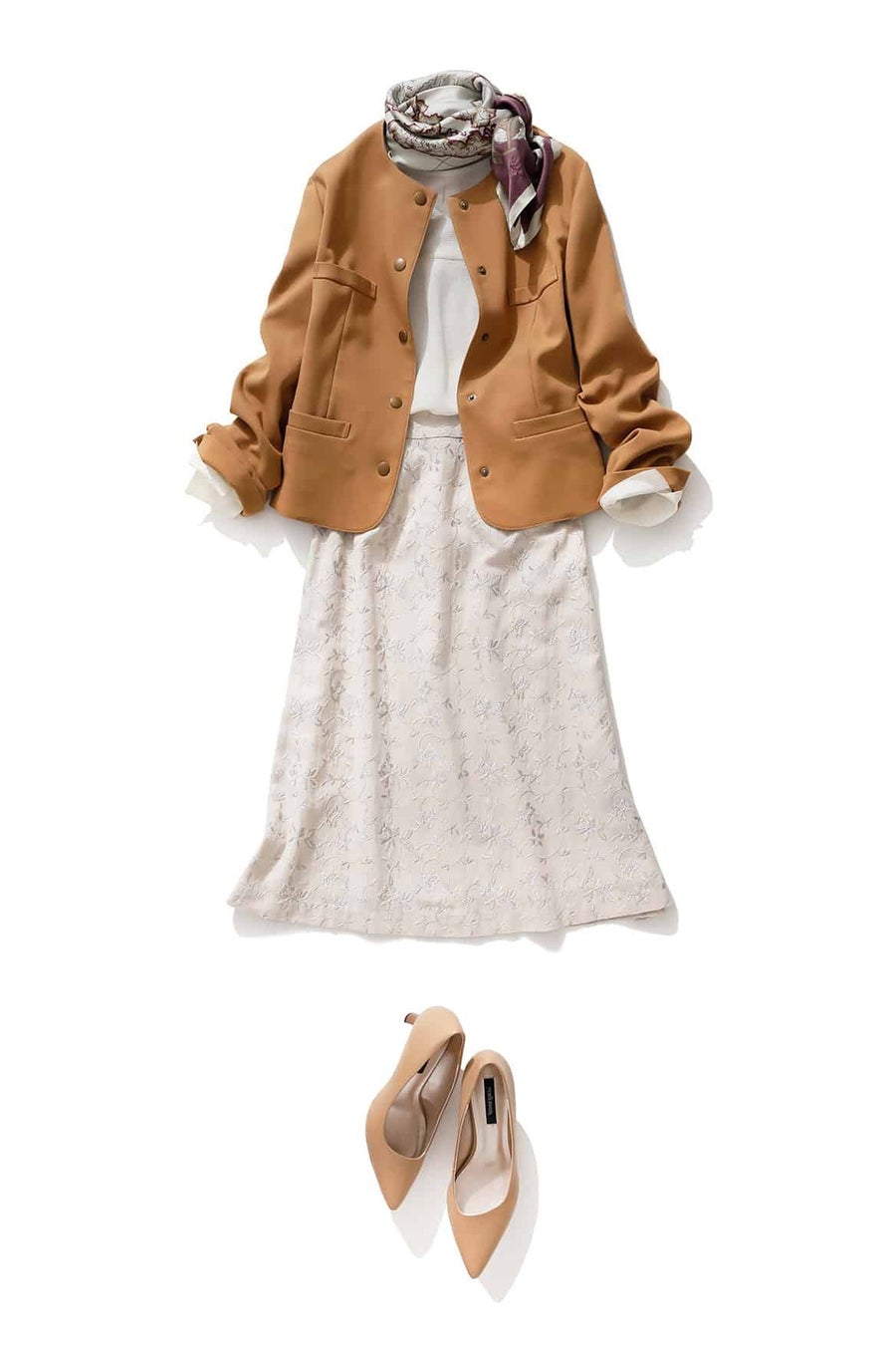 クラシカルなムードを醸し出す、春のジャケットコーデ。袖をロールアップすると手元に抜け感をプラスされ、こなれた印象に。仕上げにスカーフを巻いて、上品さを格上げ。