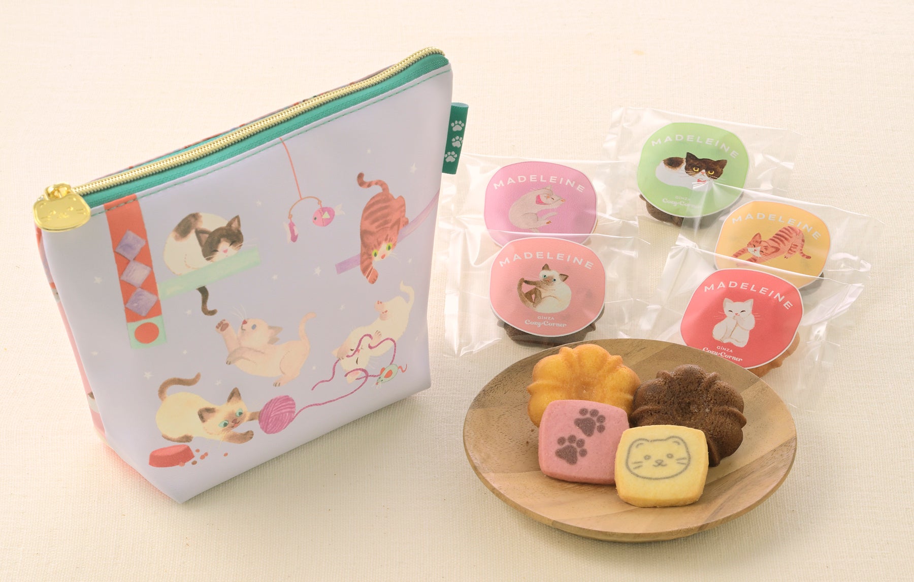 しっとりとした質感の合皮のポーチは、ファスナーの引き手部分が小ねこサブレをモチーフにしたチャームになっています。マドレーヌのフィルムデザインは5種類。ランダムに詰め合わせているので、どの小ねこに出会えるかは開けてみてのお楽しみ♪
