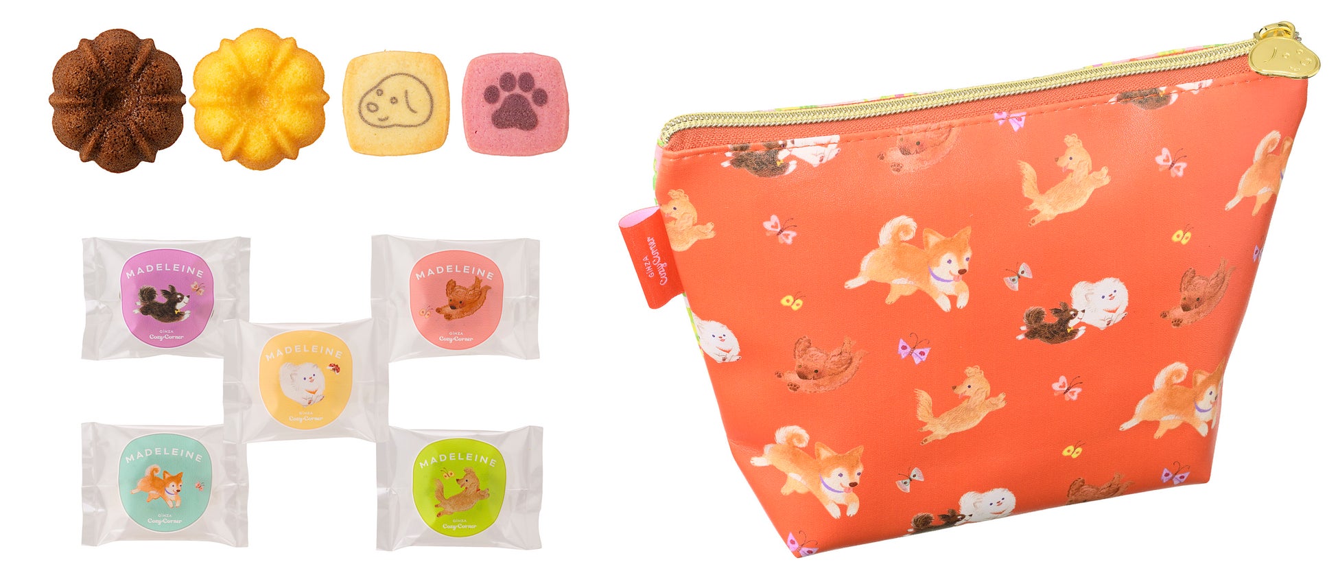 特長:柔らかな日差しの中、元気いっぱいに走り回る5種類の小犬のかわいいイラストをデザインした小犬ポーチに、マドレーヌとクッキーを詰め合わせました。
