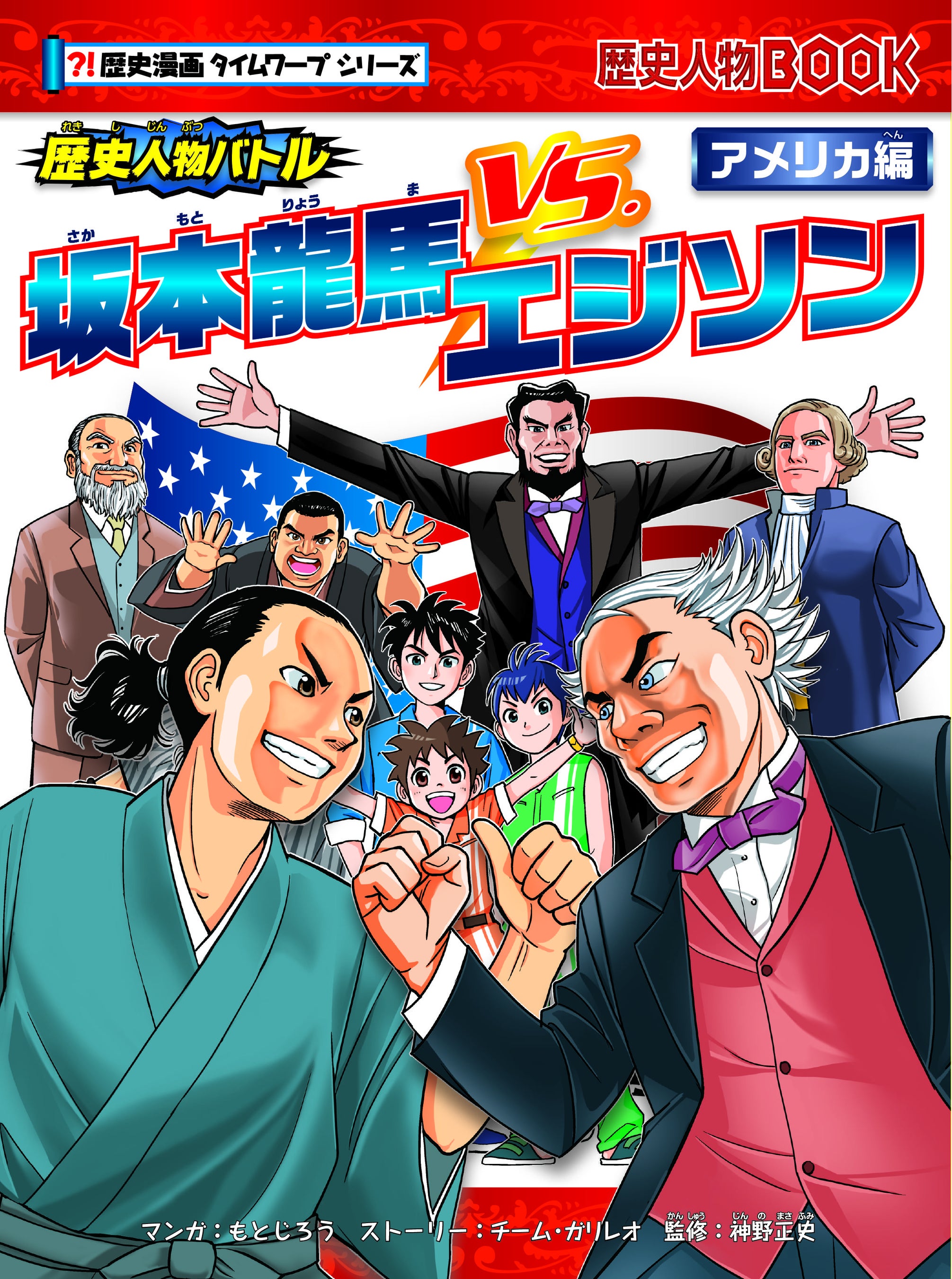 「アメリカ編」で登場するのはアメリカ独立の英雄「ワシントン」に、奴隷解放宣言の「リンカーン」。そして伝記でも大人気、偉大なる発明王「エジソン」! 対する日本チームは明治維新期に活躍した「坂本龍馬」「西郷隆盛」「伊藤博文」です。初代大統領のワシントンと初代総理大臣の伊藤博文はトランプゲームで対決? 西郷隆盛とリンカーンはあの伝統競技で激突、そしてエジソンと坂本龍馬の戦いには最後意外な結末が、そしてアメリカ側からは大物ゲストも登場――。スリルあり知恵比べあり、最後のページまで全く目が離せない展開です。バトルを楽しんでいくうちにアメリカと日本の登場人物たちが果たした役割がどんどん理解できます。