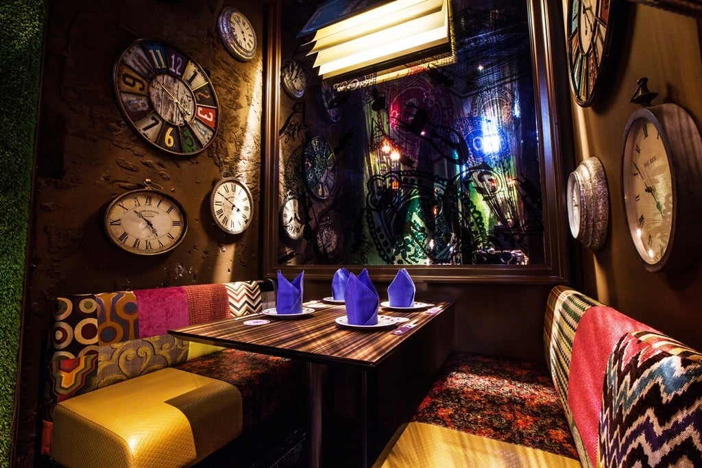 ハチャメチャな時を刻む時計に囲まれるポップなボックス席。