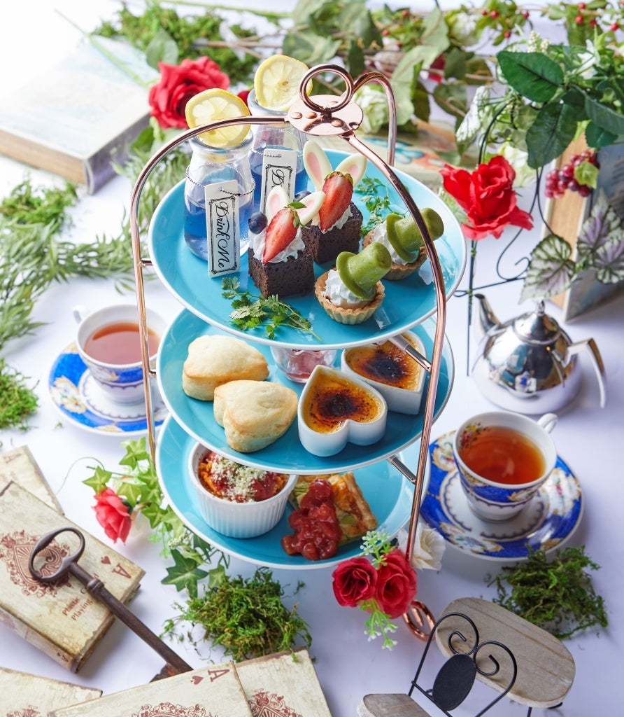 物語の中でも有名なこれらの逸話のキャラクターや小道具をモチーフにした小さなスイーツたちと、幻想の国特製の軽いお食事を取り揃え、アフタヌーンティースタイルに仕立てました。