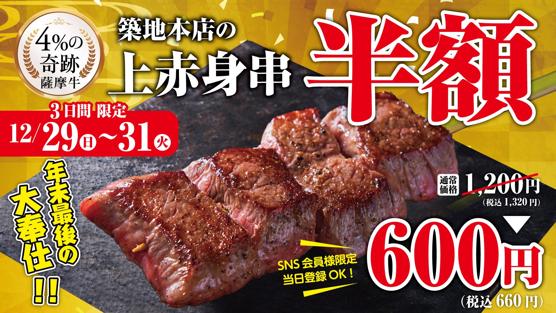 12月29日(日)~12月31日(火)3日間限定、最高級A5ランク和牛”薩摩牛4%の奇跡”を使用した「築地本店の上赤身串」通常価格1本1,200円(税込1,320円)を600円(税込660円)でご提供