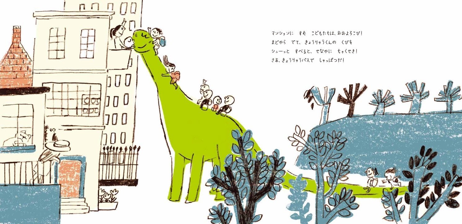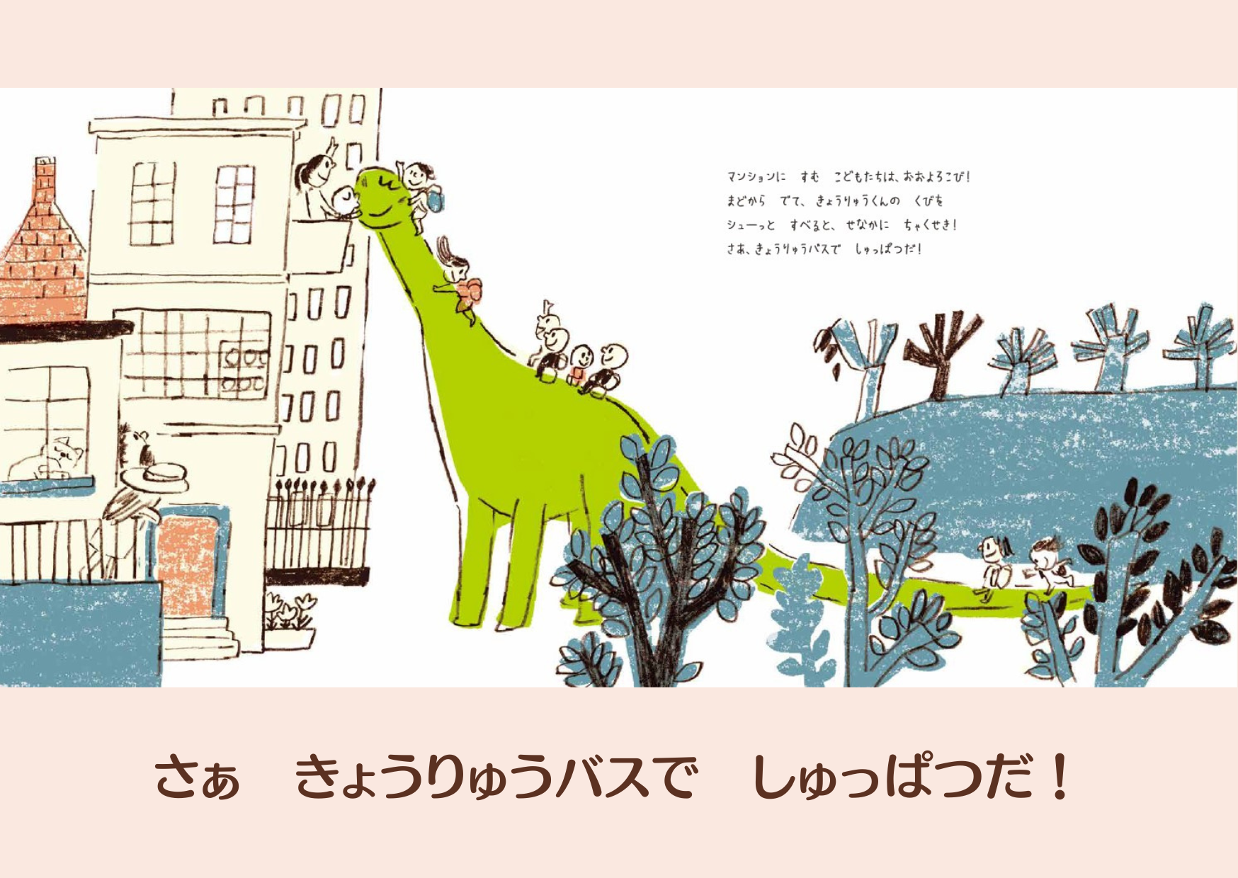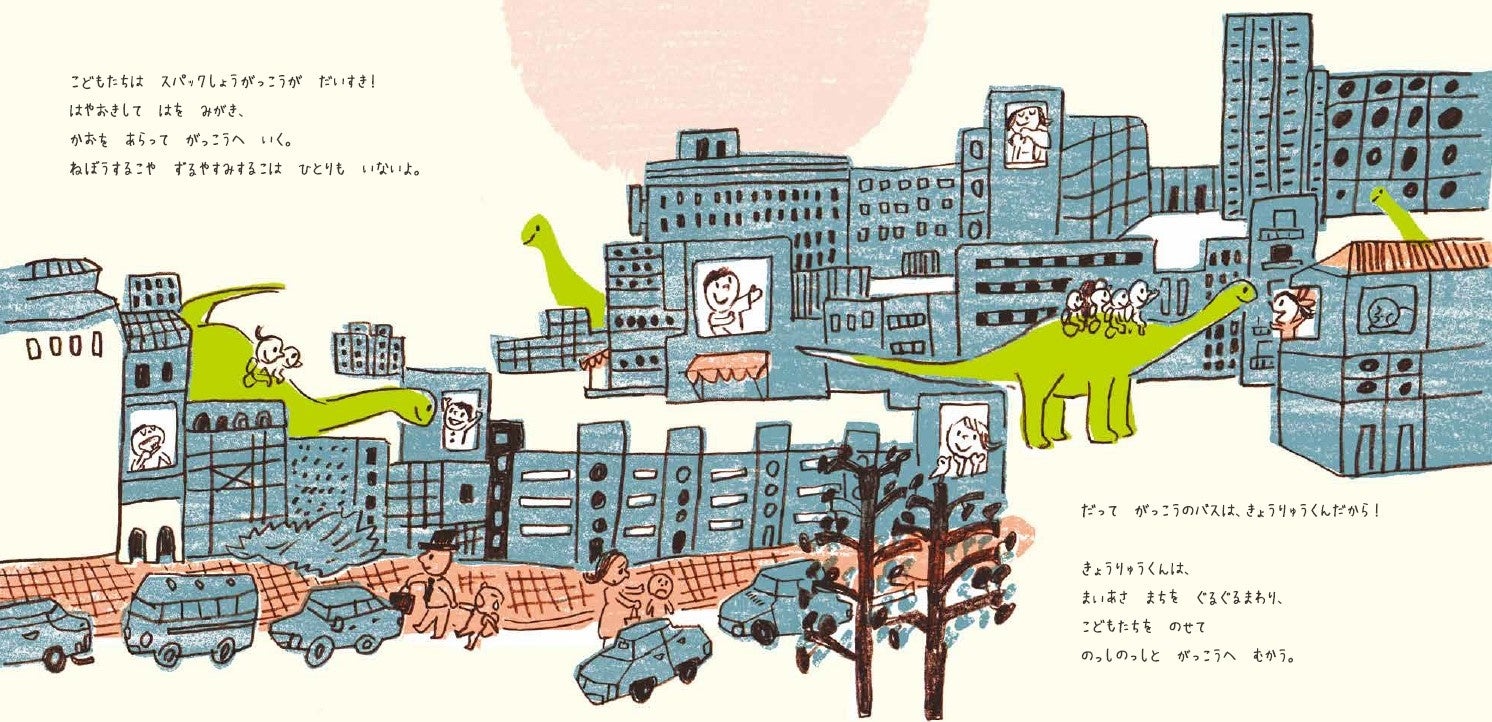 きょうりゅうくんは、みんなを乗せてドスンドスン。ゆかいに学校へ向かいます。