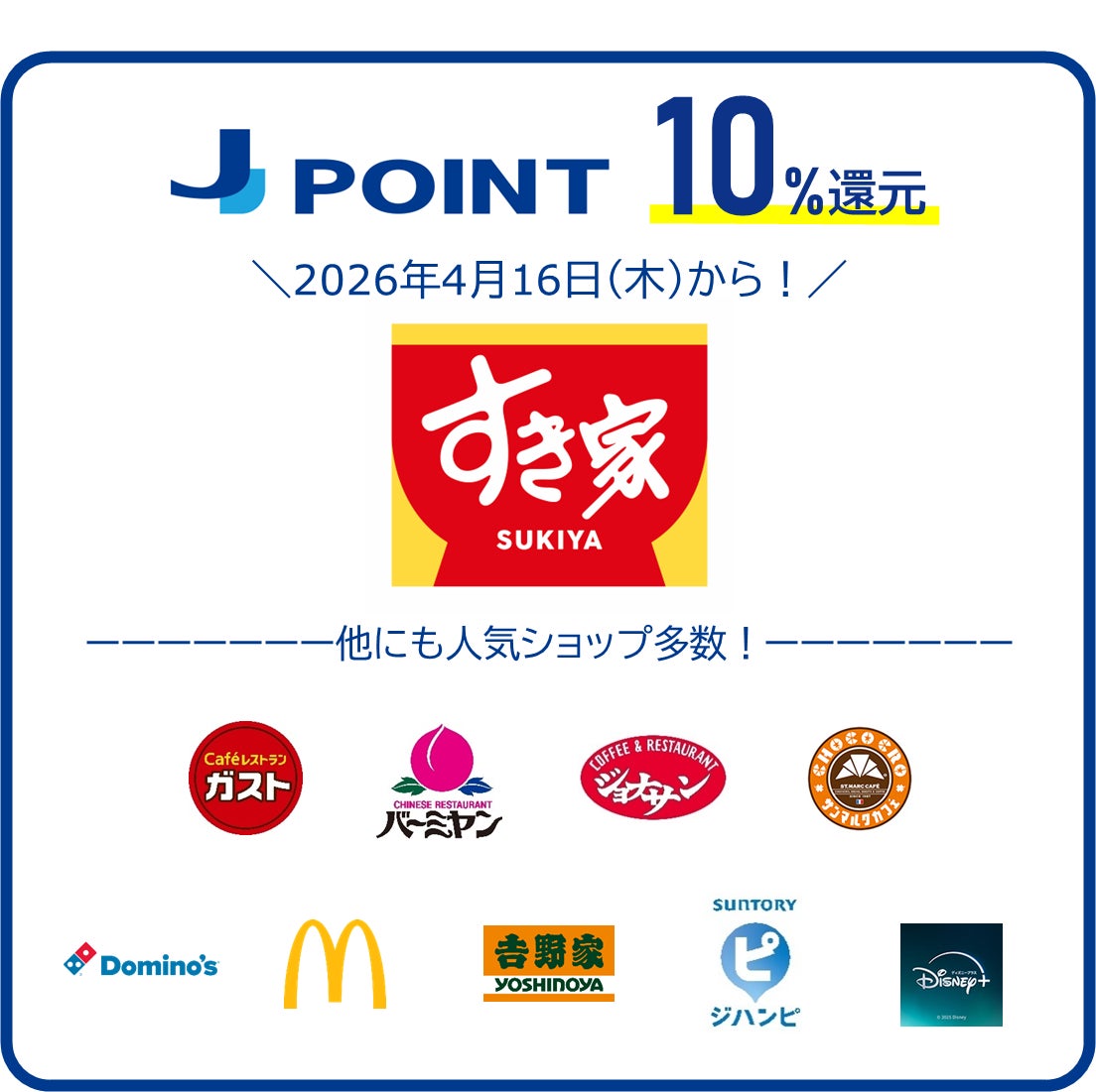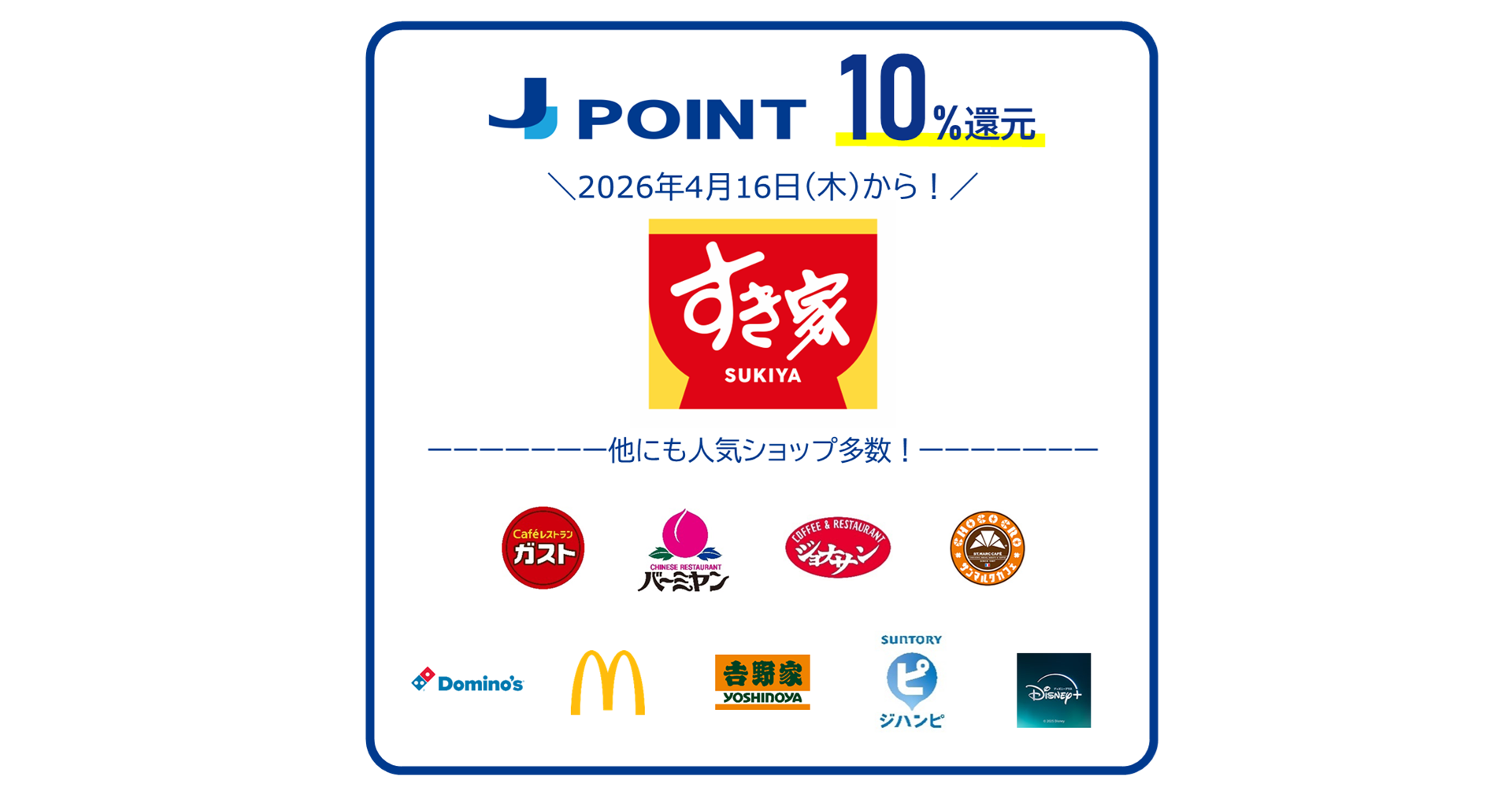 株式会社ジェーシービー(本社:東京都港区、代表取締役会長 兼 執行役員社長:二重 孝好、以下:JCB)は、いつものお店でポイントがおトクにたまる「J-POINTパートナー」の対象ショップに牛丼チェーン「すき家」を追加します。いつものお食事で、より一層おトクにご利用いただけるようになりました。