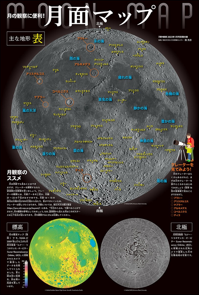 さらに、特集を読みながら楽しめる特大ポスター付録「クレーター観察ガイド付き 月面マップ」もついてきます。