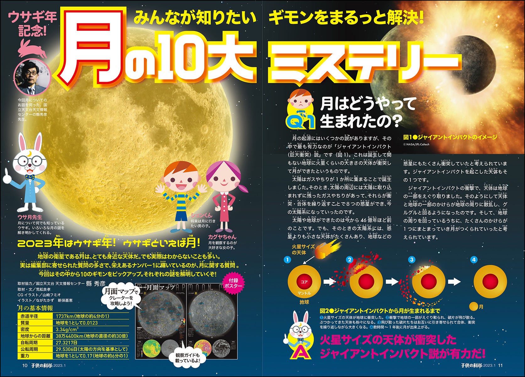 巻頭特集は「みんなが知りたいギモンをまるっと解決! 月の10大ミステリー」。2023年はウサギ年。ウサギといえば月! ということで、地球の衛星として、とても身近でミステリアスな天体、月のふしぎに迫ります。
