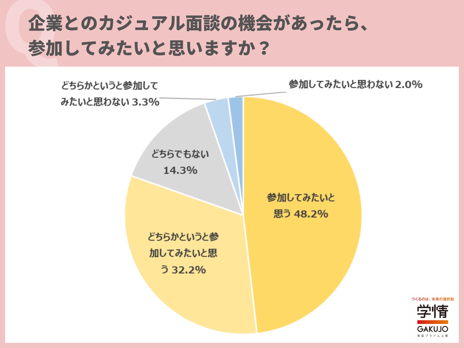 カジュアル面談について、機会があれば「参加してみたいと思う」と回答した20代後半~30代が48.2%に上りました。「どちらかというと参加してみたいと思う」32.2%を合わせると、8割以上がカジュアル面談の参加を希望していることが分かります。