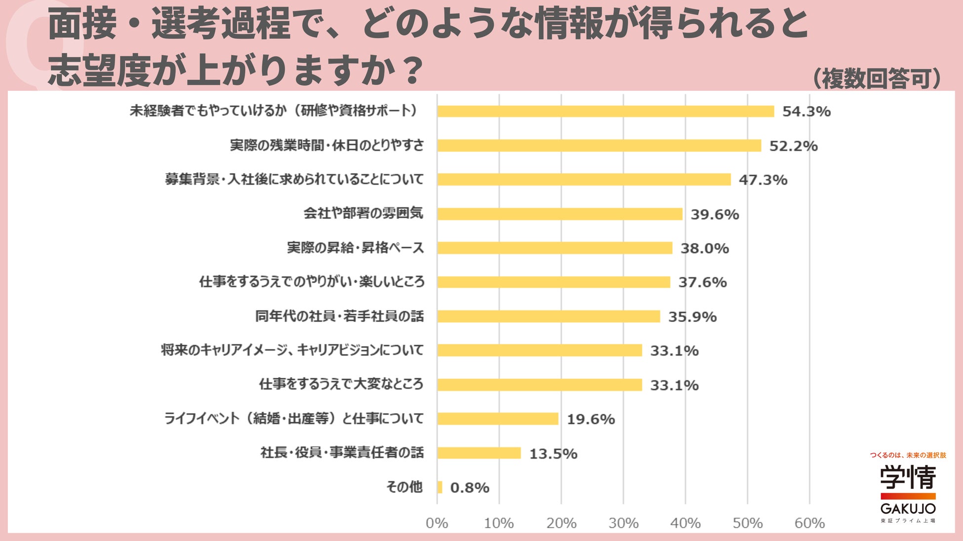 面接・選考段階で得られると志望度が上がる情報は、「未経験でもやっていけるか(研修や資格サポートについて)」が最多となりました。次いで「実際の残業時間・休日のとりやすさ」、「募集背景・入社後に求められていることについて」が続いており、「入社後、自分がどのように活躍できそうか」や「どういった能力が活かせそうか」を知りたいという意向がうかがえます。