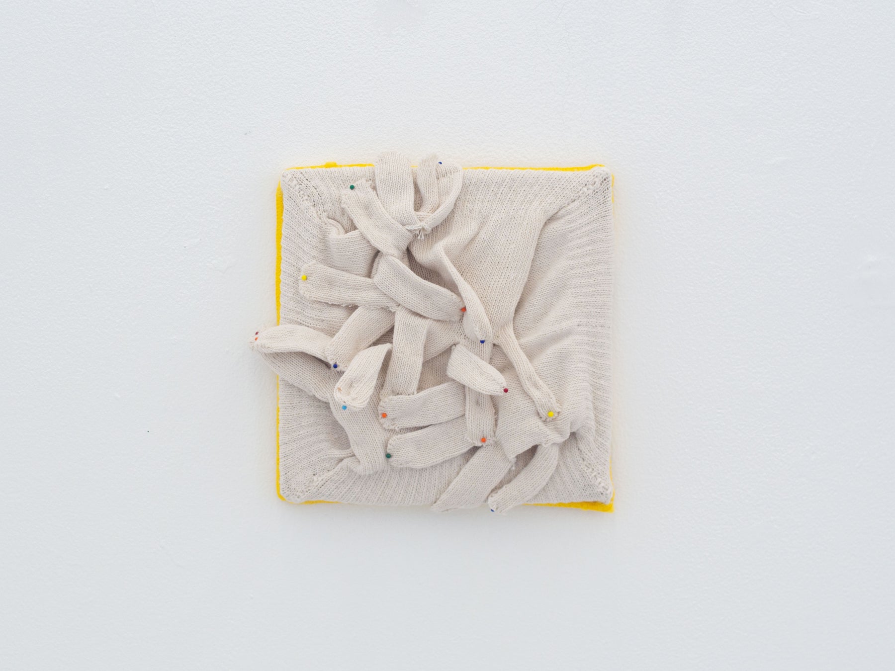 布の既製品を「ほぐす・縫う・編む」といった行為を繰り返し、新たなかたちへと変容させた作品をロビー空間に展示しています。