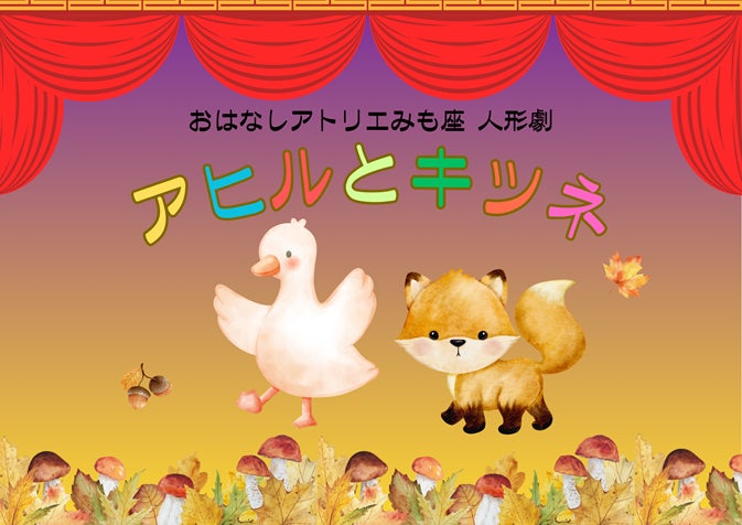 10/25 障がいのある子どもたちのための親子で造形ピクニック(要予約) 個別支援学級、特別支援学校等に通う子どもとその保護者、きょうだい、お友だちが対象の、えのぐ、ねんど、かみを使ってそれぞれのペースで自由に遊べるプログラムです。 おはなしアトリエみも座 人形劇「アヒルとキツネ」(要予約) 人形劇、アコーディオン演奏や手あそび。未就学児~小学校低学年のお子さんにおすすめです。 10/1より先着順で電話・来館受付(TEL 045-910-5700) |