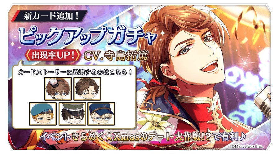 株式会社マーベラス(代表取締役社長:佐藤 澄宣/所在地:東京都品川区)による、スマートフォンゲーム『千銃士:Rhodoknight』(読み:せんじゅうし ろーどないと 以降、『千銃士R』)は、12月15日より開催中のイベント「きらめく★Xmasのデート大作戦!?」にあわせて、イベント内で活躍する★3「【聖夜の貴公子】グラース(CV:寺島拓篤)」の新カードがピックアップで登場する期間限定ガチャを開催いたします。