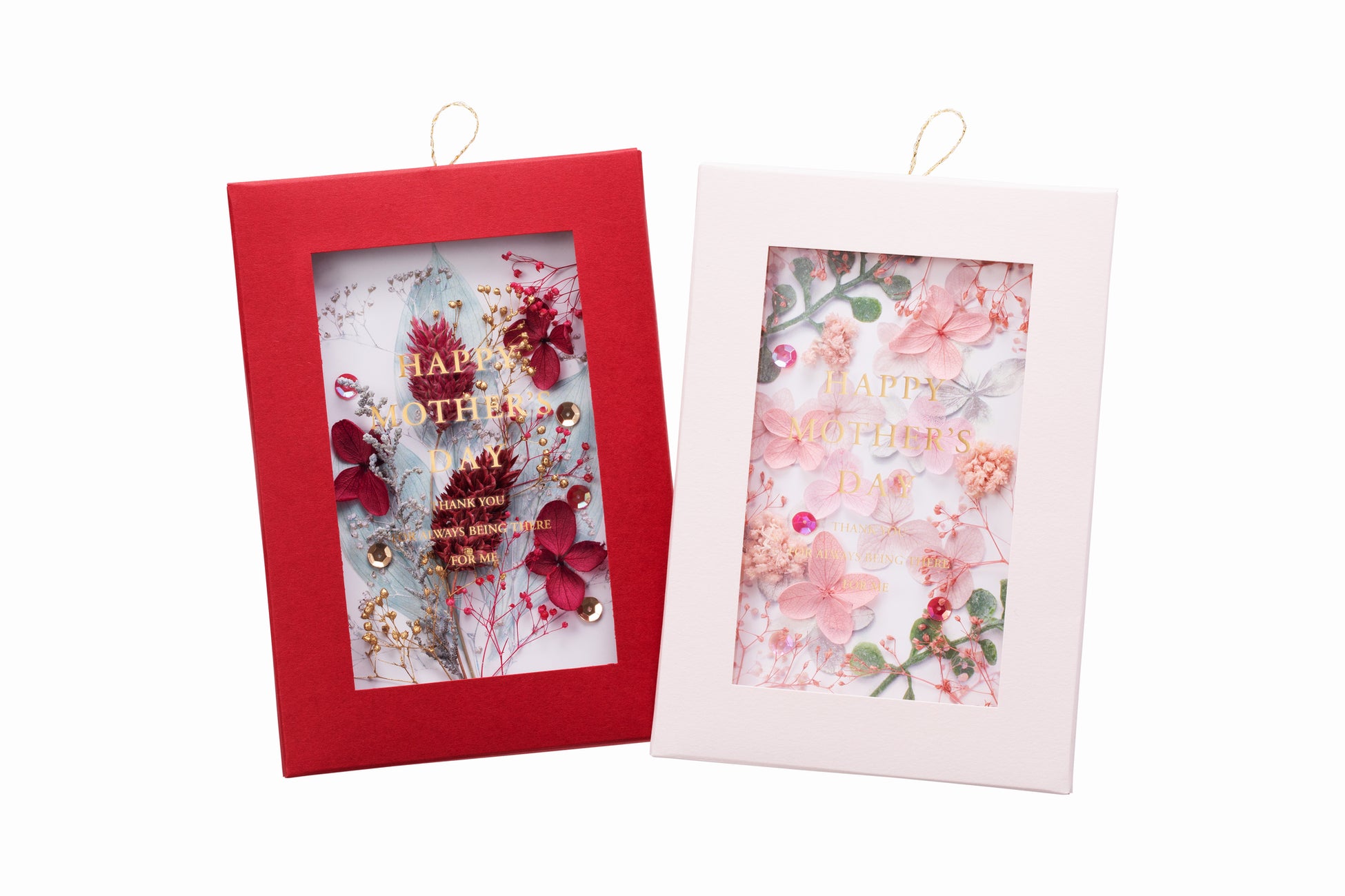 ドライフラワーを閉じ込めたカード。部屋に飾って楽しむこともできます。