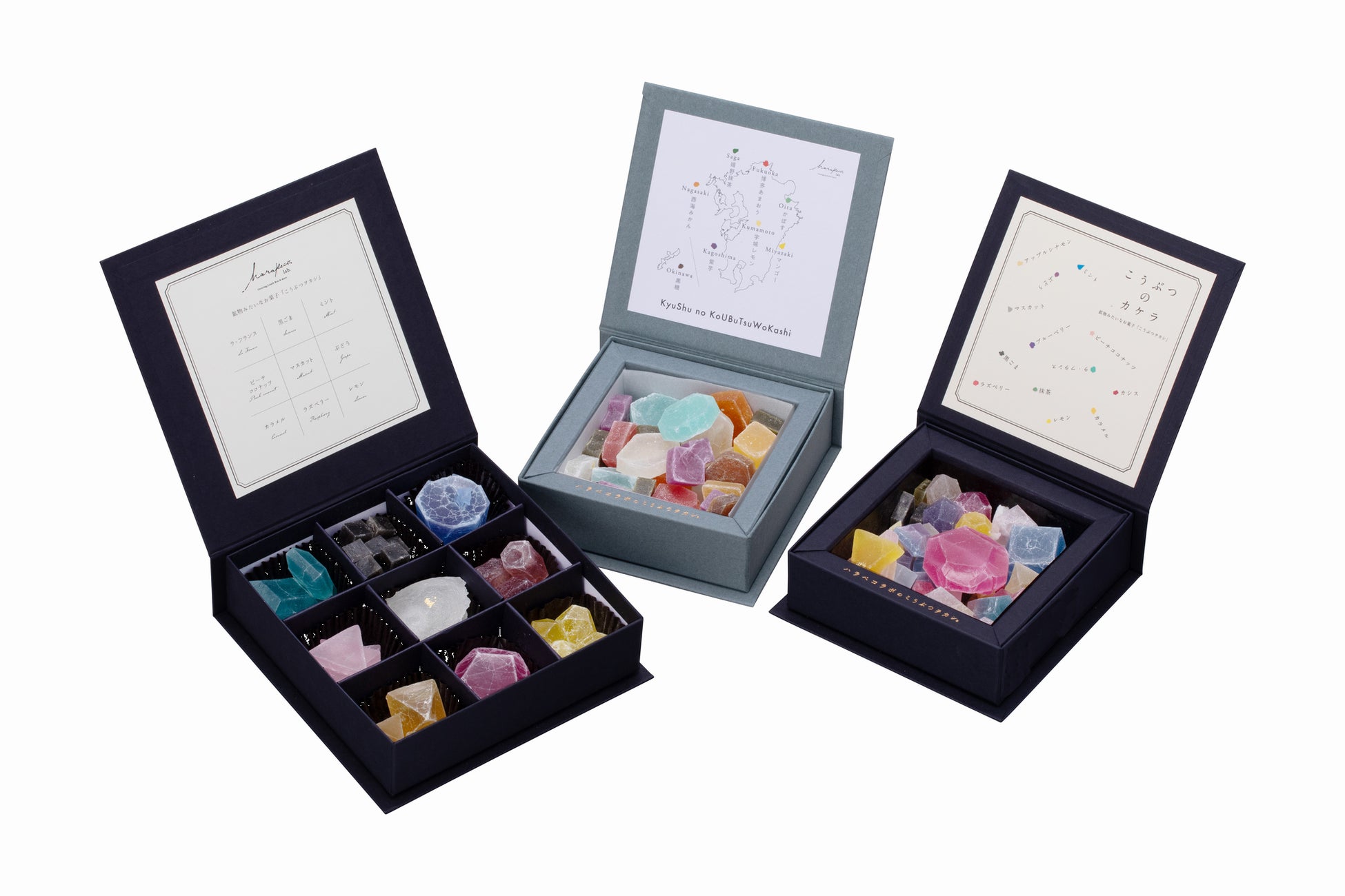 砂糖と寒天からできた和菓子の琥珀糖を、鉱物や宝石のようなイメージで作ったお菓子。ひとつひとつ職人の手で切り出しています。