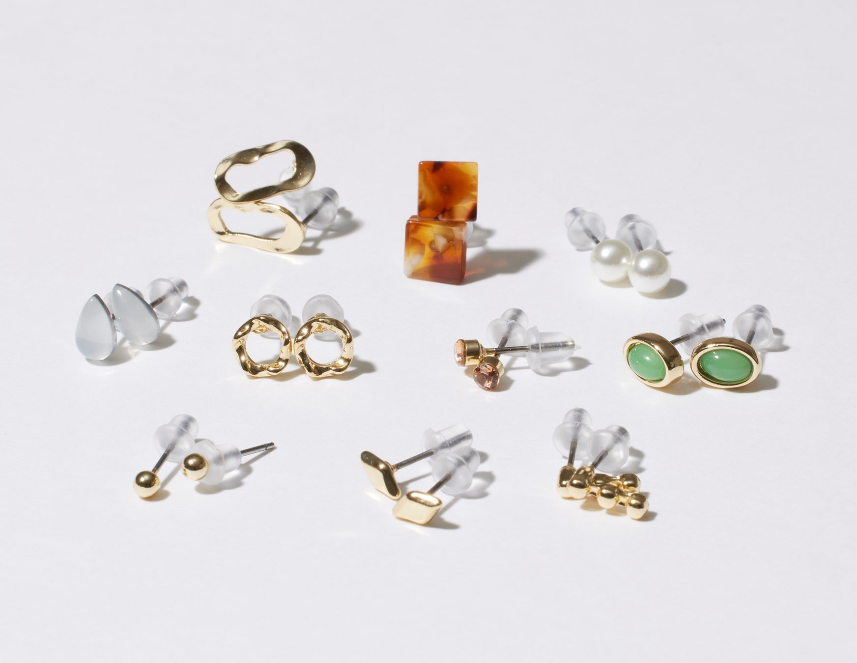 10組のピアスが1セットになった商品。小ぶりな定番のデザインで、トレンドに関係なく長くご使用いただけます。この1セットで、1週間毎日違うピアスをお楽しみいただけます。