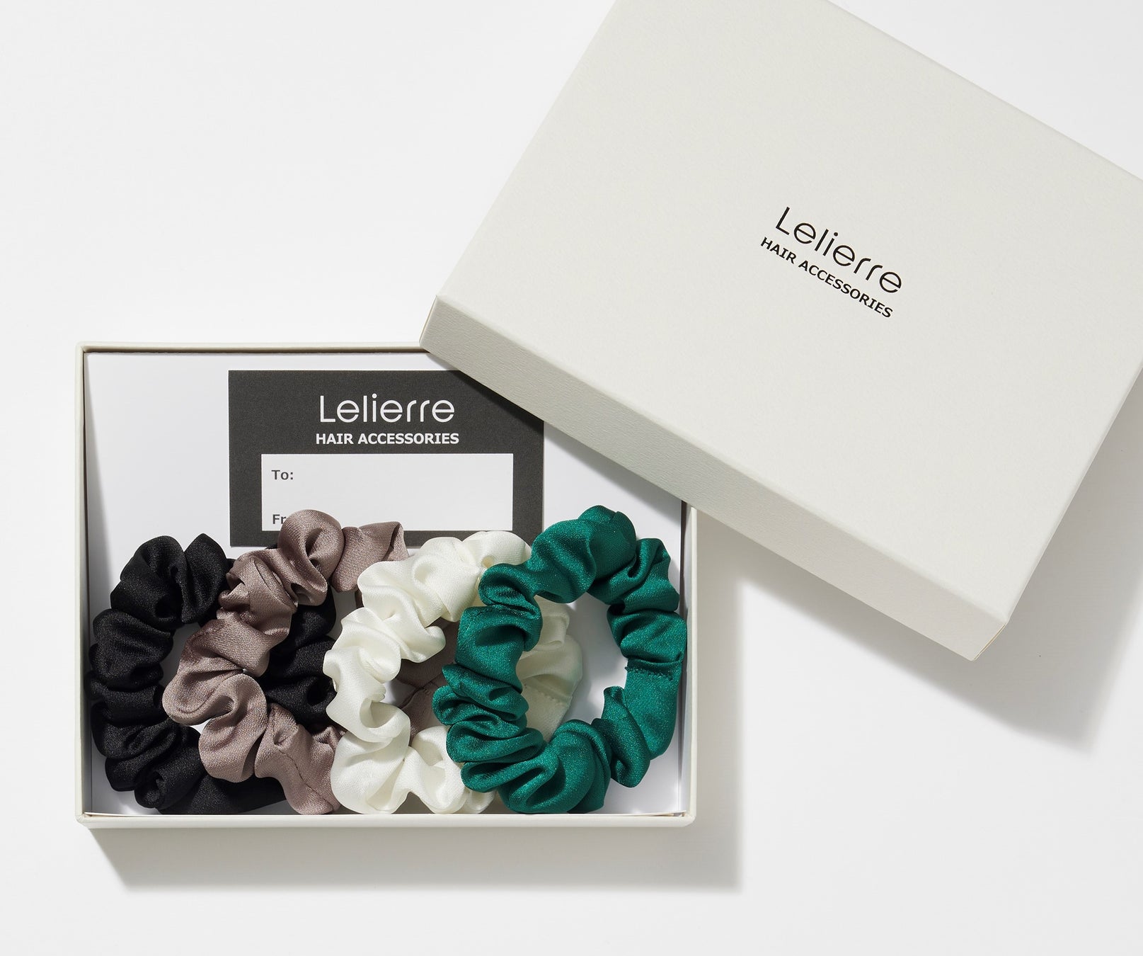 ミニシュシュ4個セット。程よく光沢のある生地を使用し、少し上品なイメージに仕上げています。1本でも、重ね付けでもご使用可能で、腕に付けているだけで可愛らしく見えるアイテムです。半袖になるこれからの季節におすすめの商品。『Lelierre』のBOX入りの商品となっており、中にメッセージカードも付いていますので、ちょっとしたギフトにもおすすめの商品です。※写真の商品の他3色展開