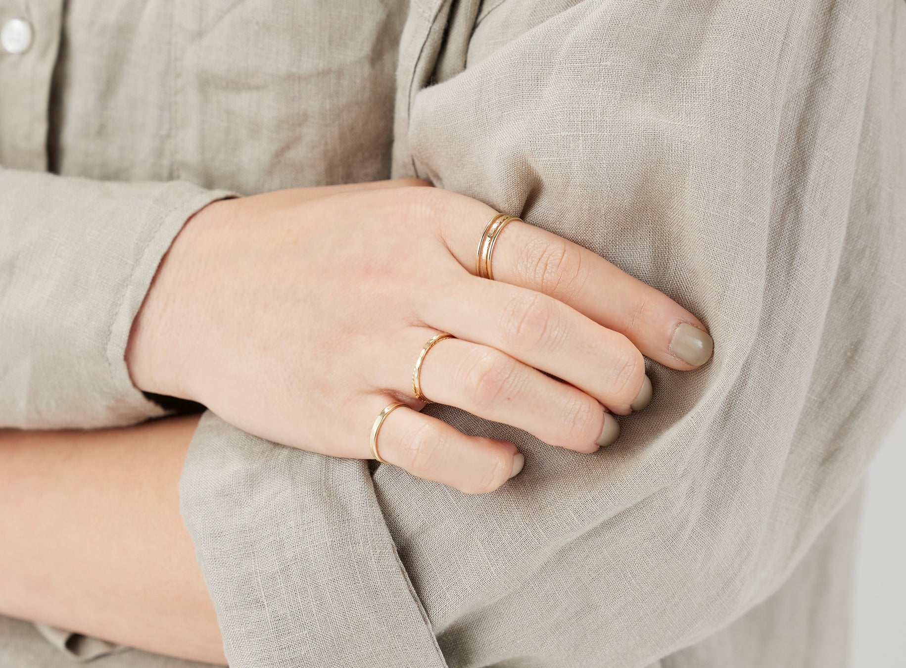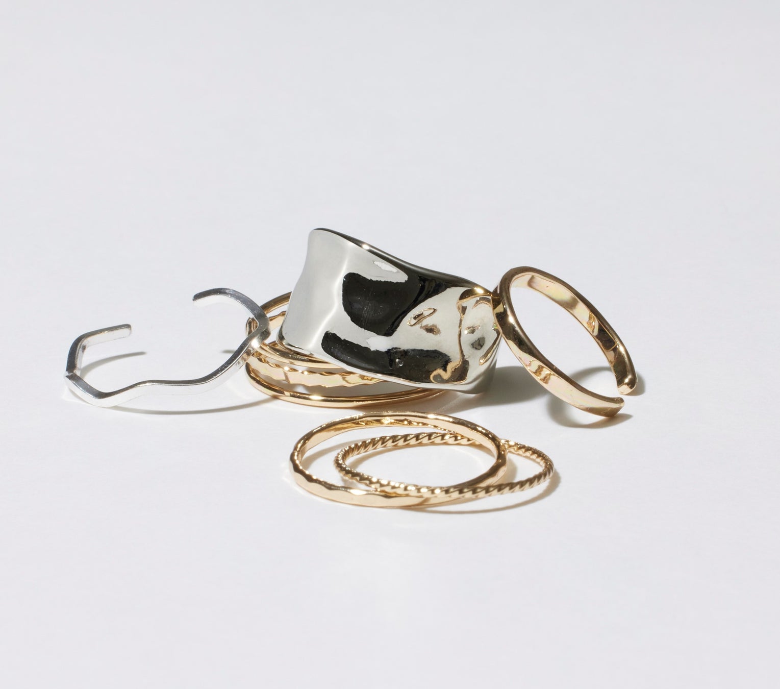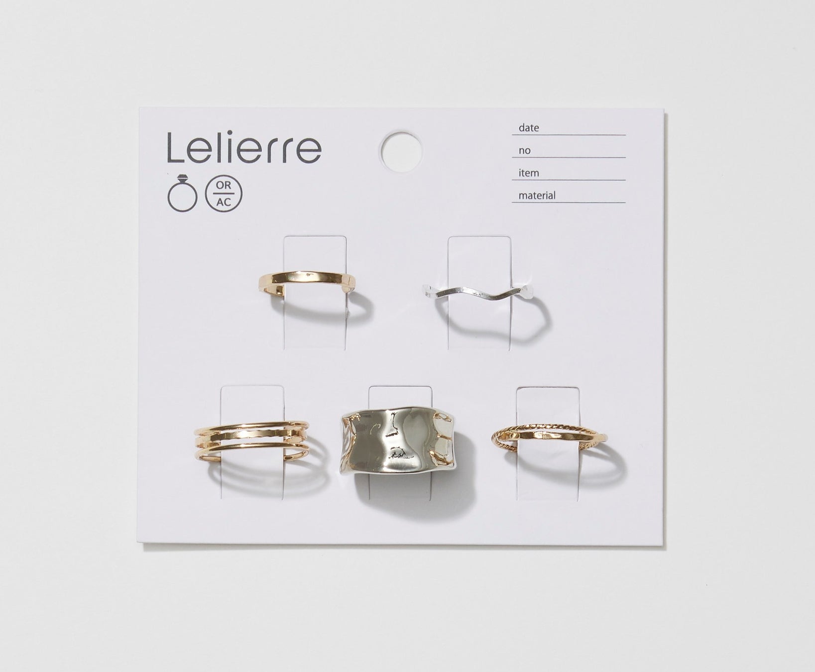シンプルなデザインからトレンドの太めのものまで、デザインの違う5個をセットにしました。サイズも、ピンキーサイズ~フリーサイズとなっており、1つで、複数で、重ね付けでもご使用いただけ、アレンジを楽める商品となっています。