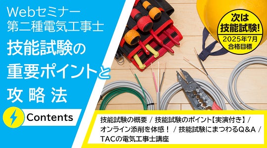 電気工事士試験対策講座を展開しているTAC株式会社(東京都千代田区、代表取締役:多田敏男)は5/25(日)に実施される『令和7年度上期 第二種電気工事士試験』の難易度分析や講評、解法などを解説する試験講評を、5/29(木)にTACのWebサイトで公開いたします。さらに!7月技能試験攻略のポイントを実演を交えてお伝えするWebセミナーを公開しています。