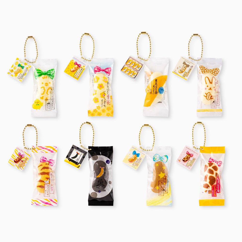 こちらのセットをご購入いただくと、「東京ばな奈スクイーズマスコット」を全8種からランダムで1個プレゼント。まるで本物みたい?!ぶにぷに感触がクセになるかわいいミニチュアキーホルダーです。