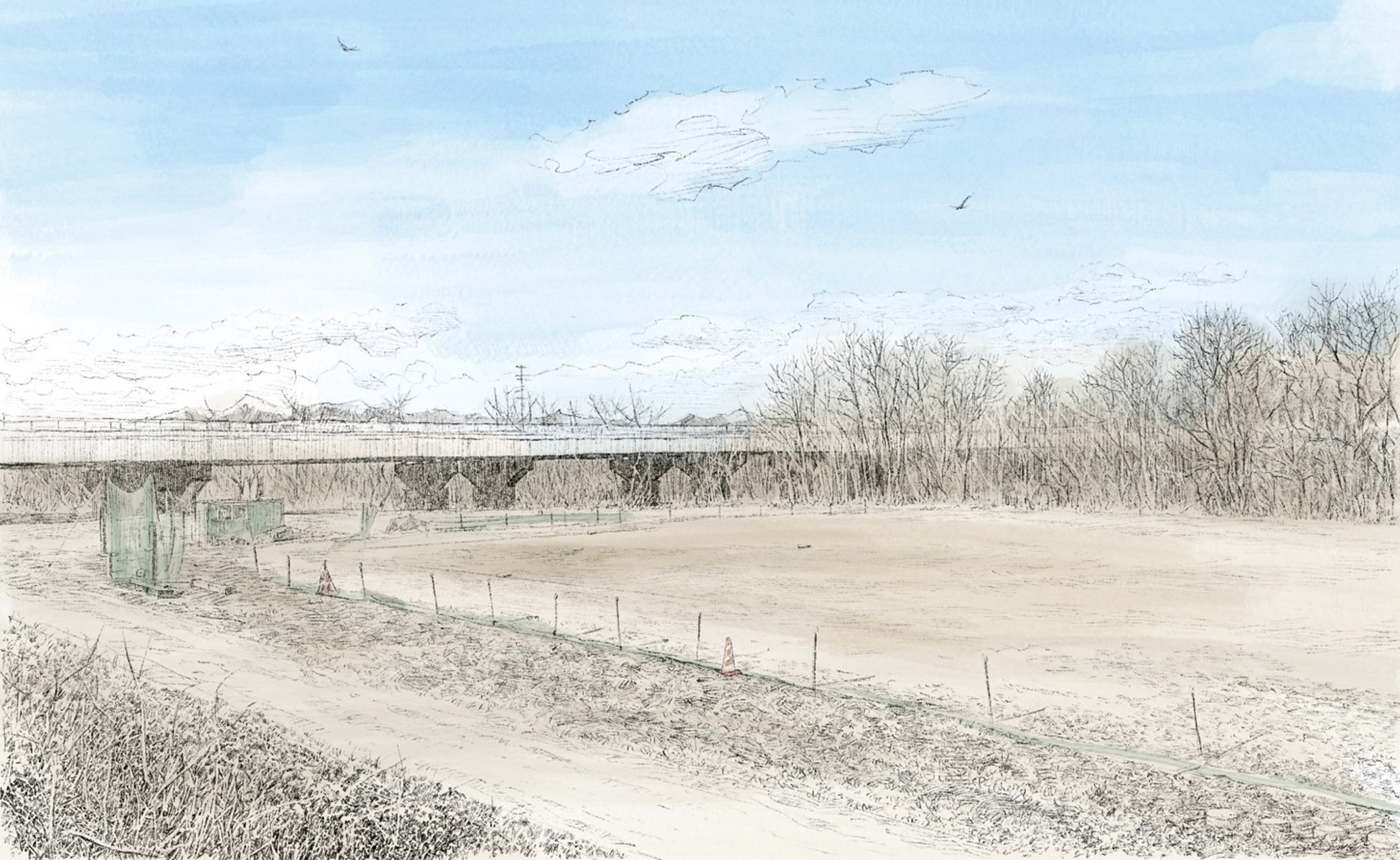 Ohtani Signature Logoを制作した漫画家の井上雄彦氏による大谷選手が少年時代に野球をしていた練習場の風景のスケッチ