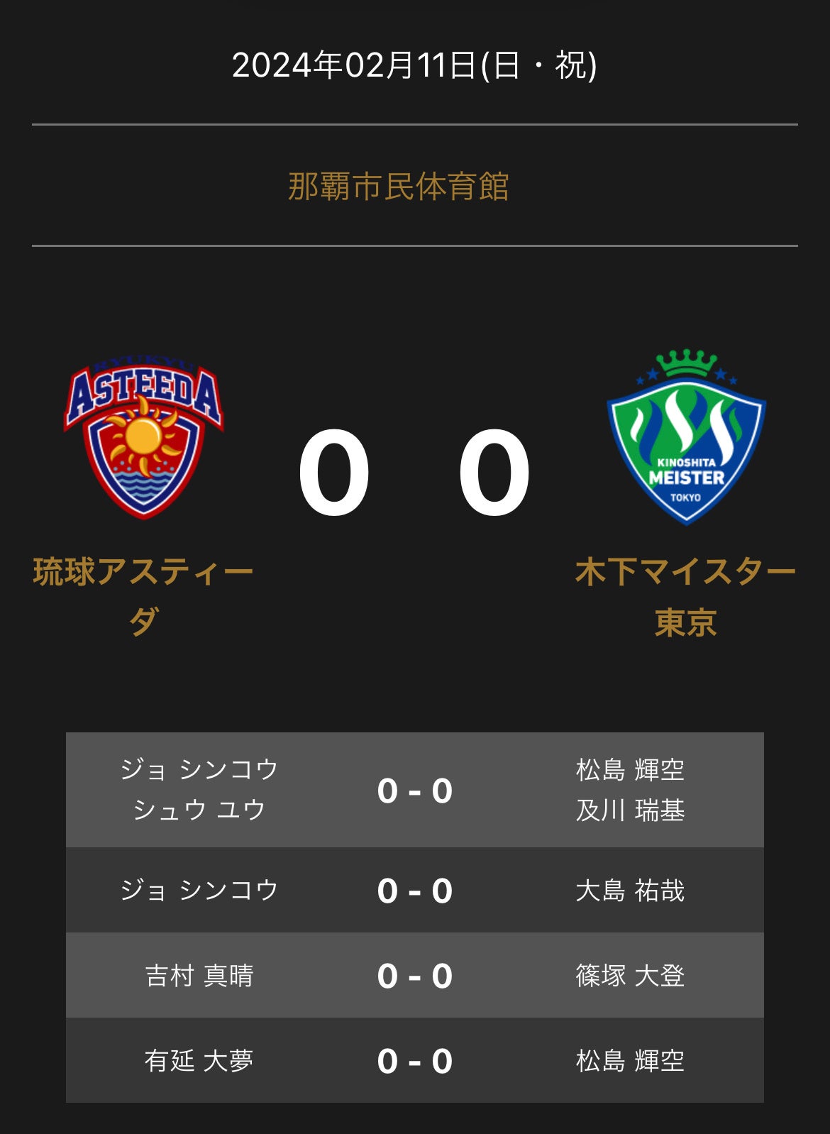 ノジマTリーグ 2023-2024シーズン 公式戦 2月11日開催 琉球アスティーダ vs 木下マイスター東京 オーダー発表