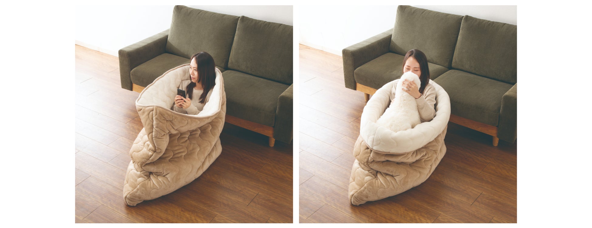 今回ご紹介するのは、ポケットのような形をした大型のブランケットです。幅が約115cmあり、人が1人入るのにちょうどいいサイズ感で、全身包まれてリラックスできます。また、ペットと一緒に入って、2人だけの時間を過ごすことができます。