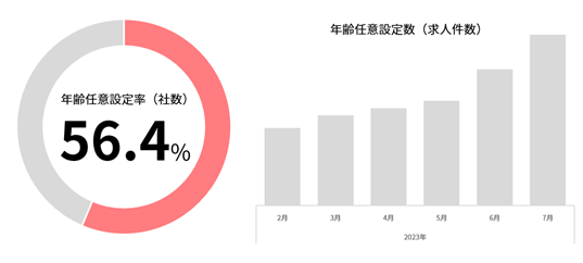 当社では募集・採用時における無意識のバイアスを解消し、多様な就業機会を創出する取り組みの一環として、運営する求人情報サイトにおいて応募時の年齢入力を求人企業が任意・必須へ選択できるようにしています。(※3)年齢入力が任意となっている求人企業数は増加を続けており、当社が運営する「バイトル」等の求人情報サイトにおける7月時点での設定企業は56.4%(※4)となっています。