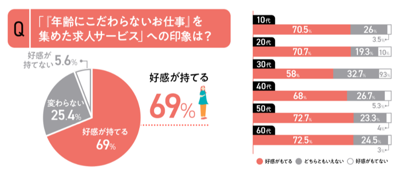 また、「年齢にこだわらない求人」を集めたサービスに対する好感度は全体で69%でした。年代別では、10代・20代の7割以上が好感を持つと回答しており、特に若年層からの関心が高いことが明らかとなりました。